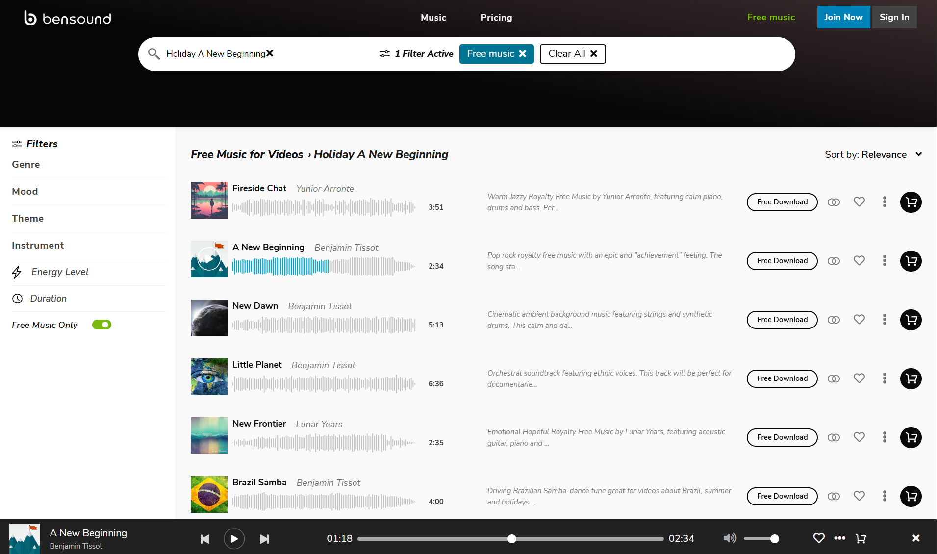 카테고리별로 정리가 잘 되어 있으며, 비교적 트렌디한 음원을 제공합니다. 크리스마스 관련 키워드 외에도 'A New Beginning'(잔잔하고 희망찬 분위기)이나 'Elevate'(밝고 경쾌한 분위기) 같은 키워드로 검색해보세요. Free Music Only 에 체크하면 무료로 사용할 수 있는 음원을 찾을 수 있습니다. 물론 여기서도 라이선스를 확인하는 것을 잊지 마세요.