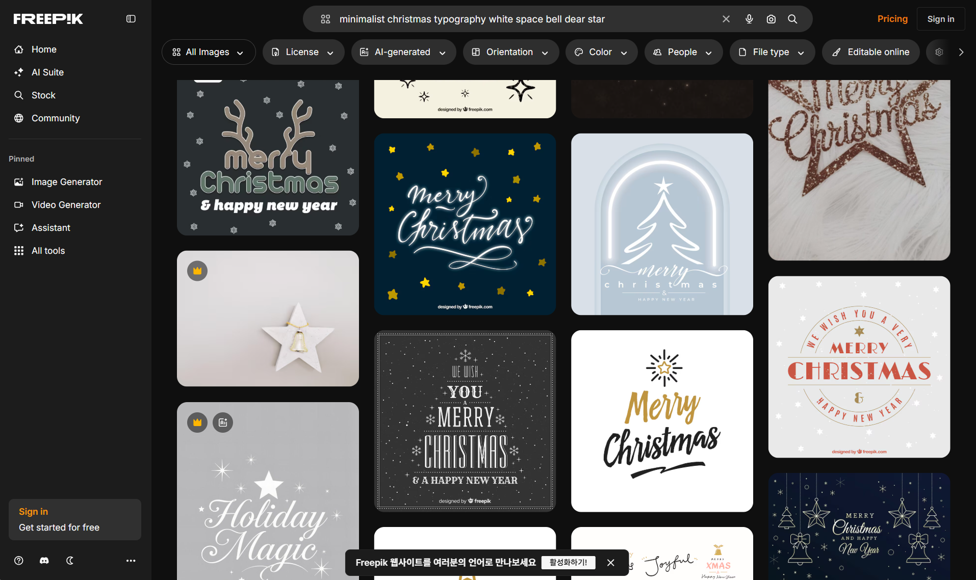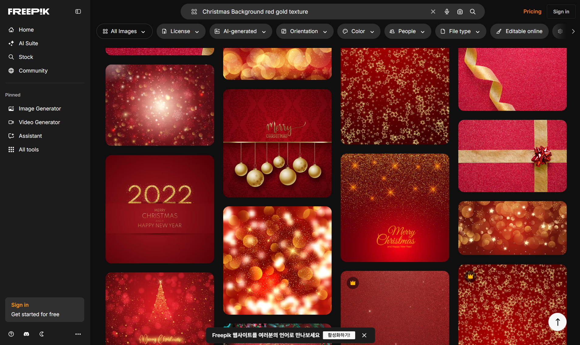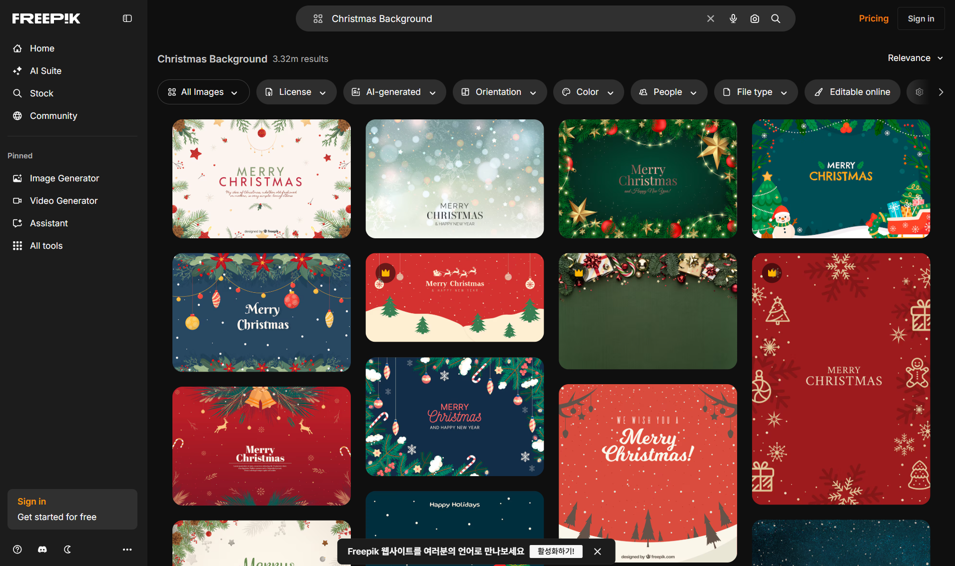 무료 계정으로도 충분히 활용 가능한 크리스마스 벡터 소스를 제공합니다. 텍스처, 리본, 배너 템플릿까지 다양하게 갖춰져 있어요. 자체적인 편집 도구를 제공하니 템플릿을 바로 수정해서 사용할 수 있습니다.