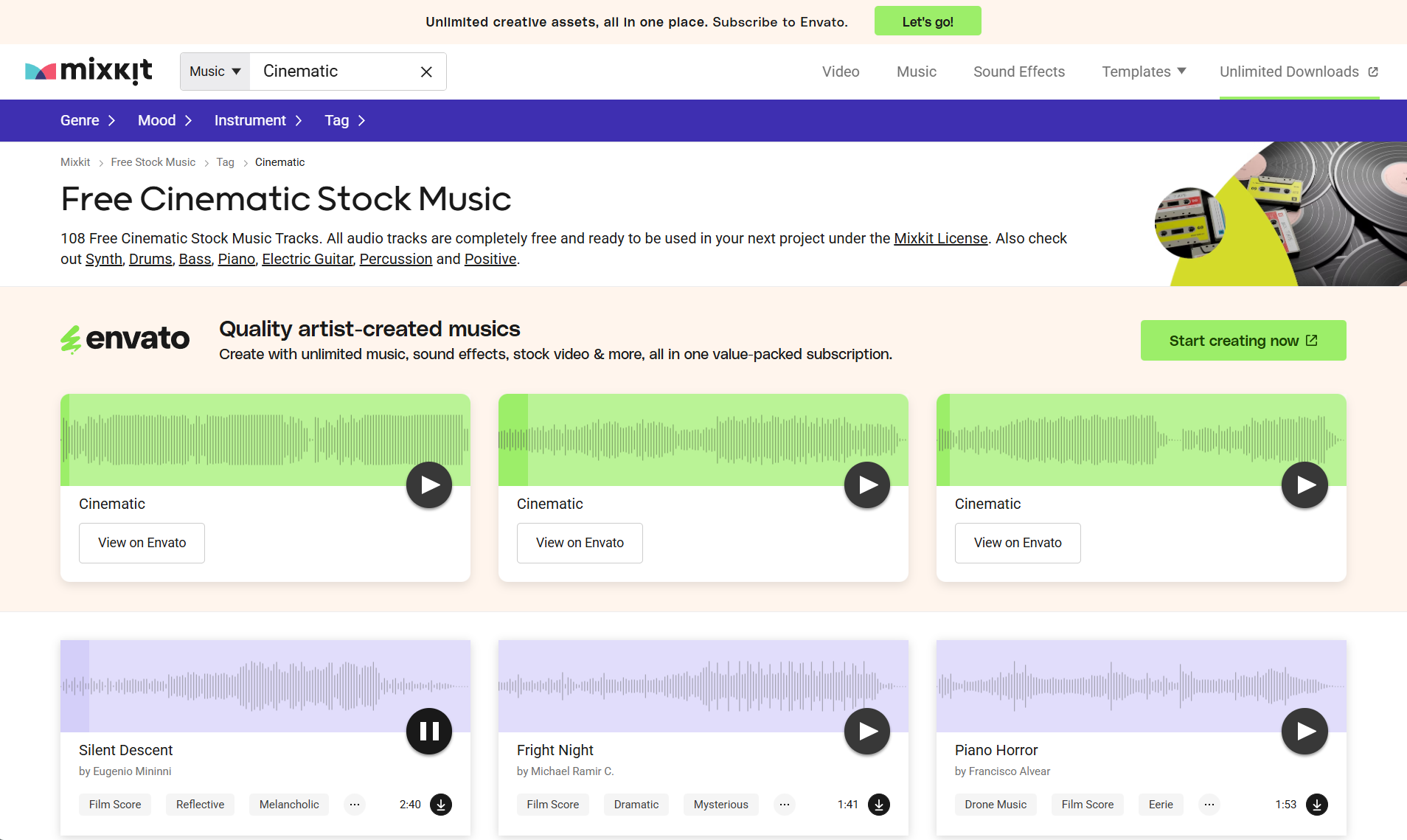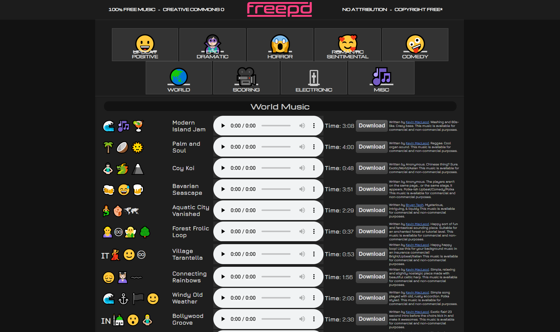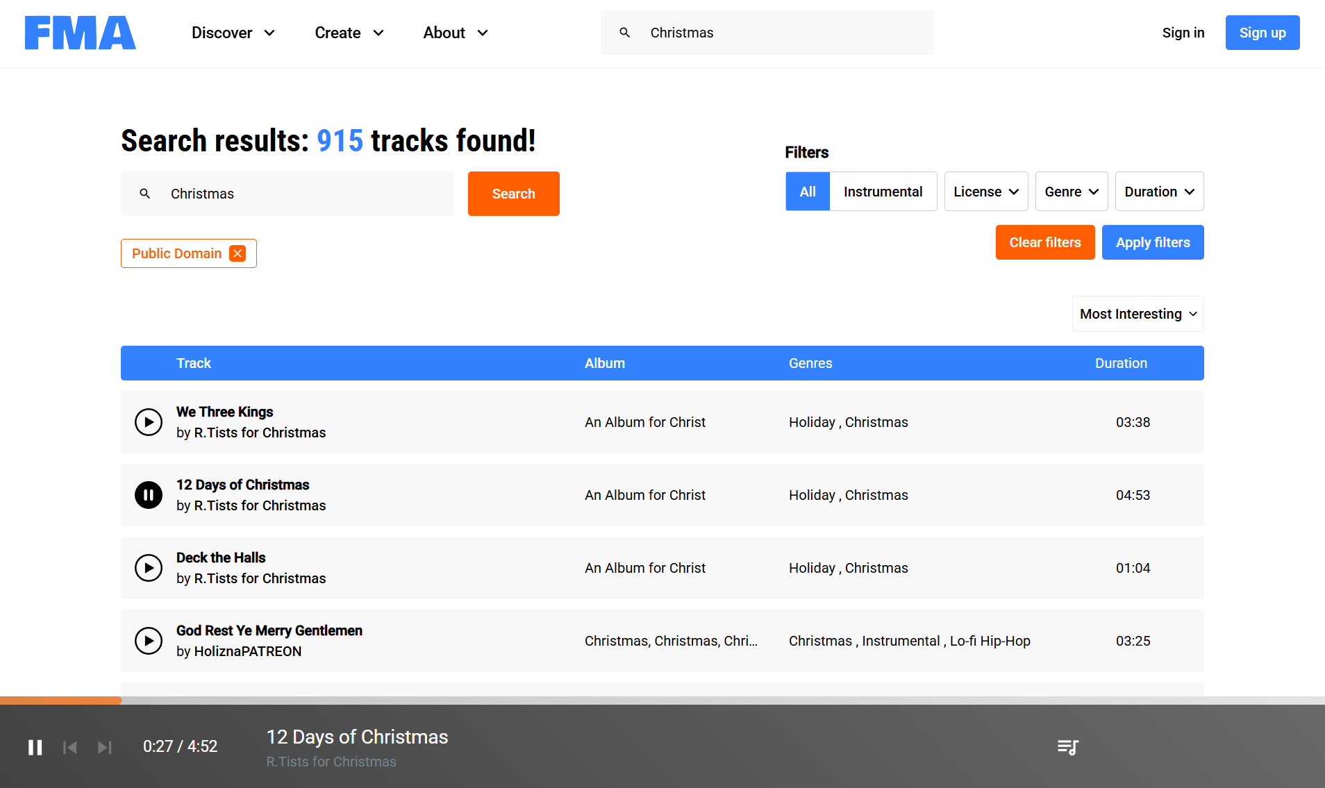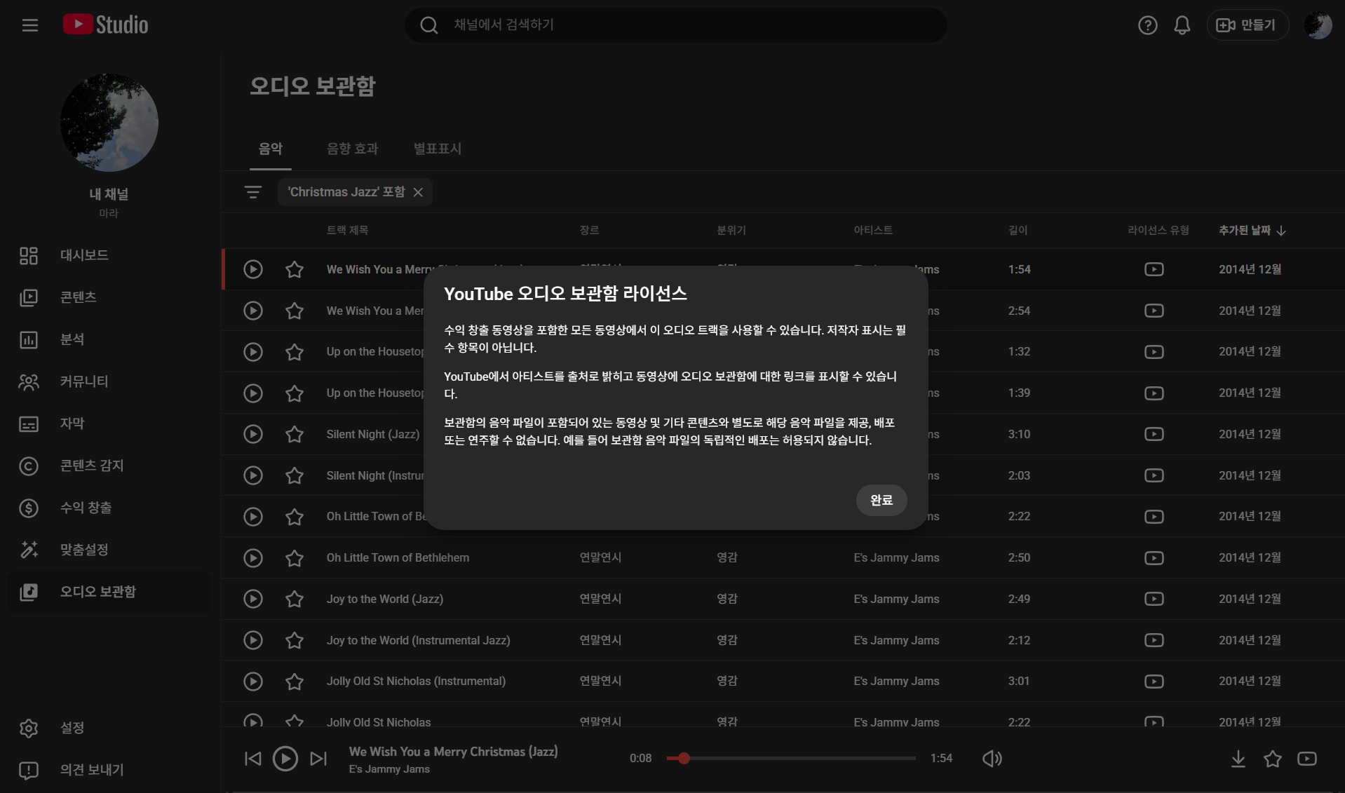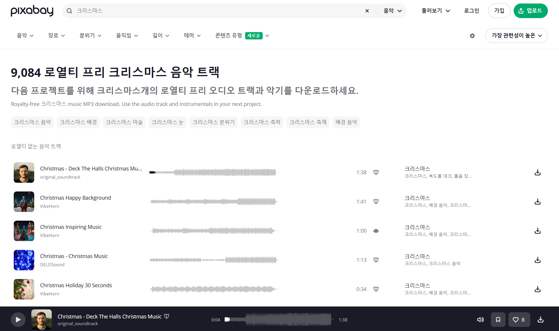 가장 접근성이 높고 방대한 양의 음원을 제공합니다. 영상용으로 가장 안정적이며, 크리스마스, 재즈, 어쿠스틱 풍 음악을 다양하게 제공합니다. 'Carol', 'Christmas Jazz', 'Holiday' 키워드로 검색한 후 원하는 것을 선택하세요. 콘텐츠에 적용하기 전에 라이선스 유형을 반드시 확인하세요.