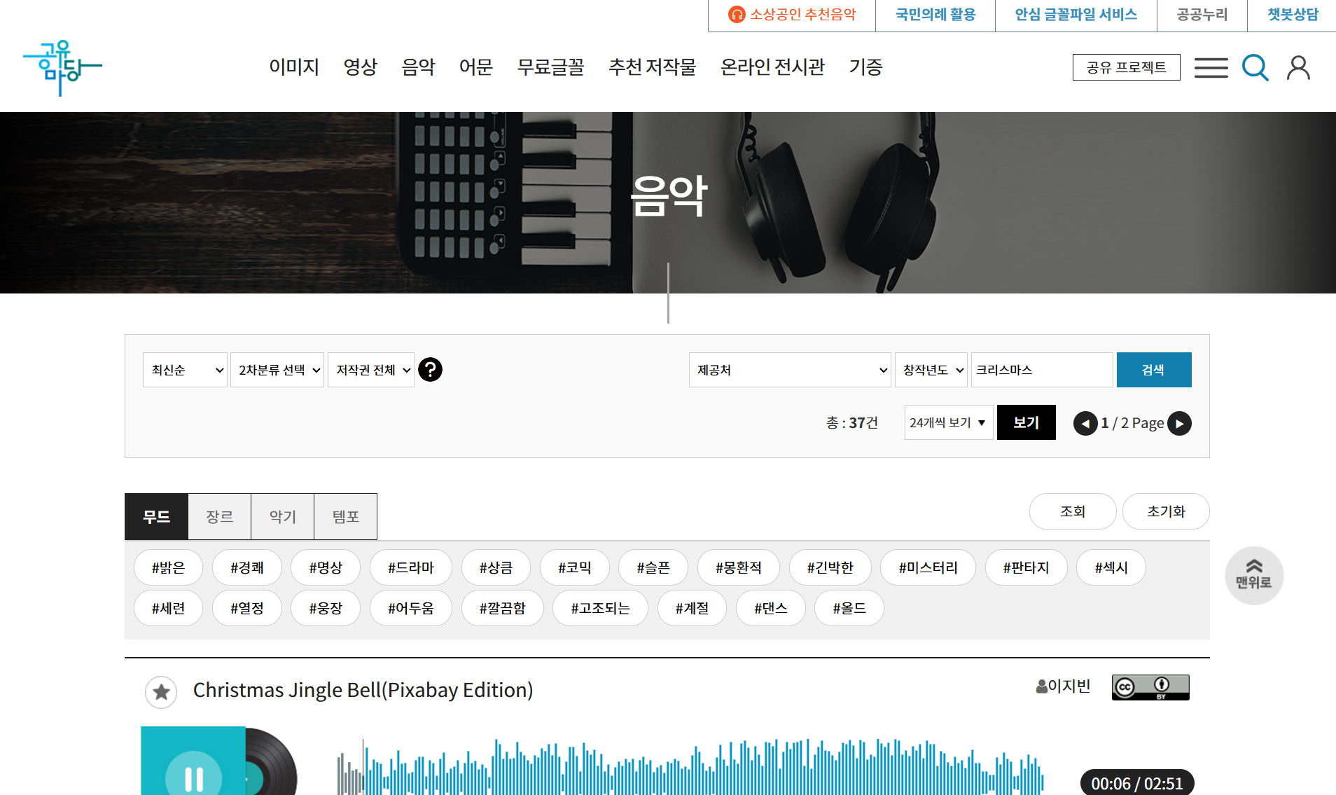 공유마당에도 크리스마스 관련 음원이 있습니다. 공유마당은 한국저작권위원회에서 운영하는 국내 최대 공유 저작물 플랫폼입니다. 국내 창작자들의 다양한 CC 라이선스 음악을 제공합니다. 국내 저작물 중심으로 제공되어 친숙한 분위기의 음원을 찾기 용이합니다. '명절', '연말', '캐롤' 등의 키워드를 통해 한국적인 정서가 담긴 시즌 BGM이나 효과음을 찾는 데 활용될 수 있습니다.