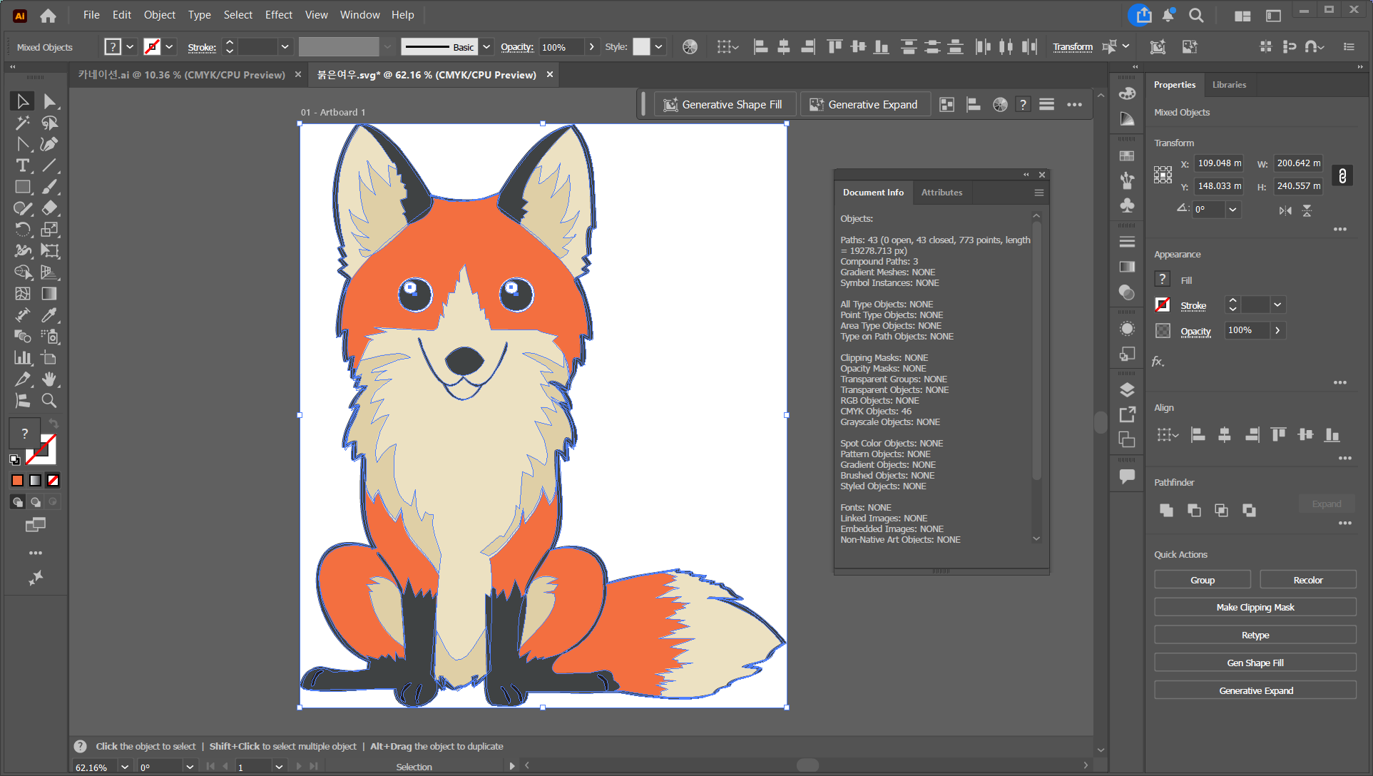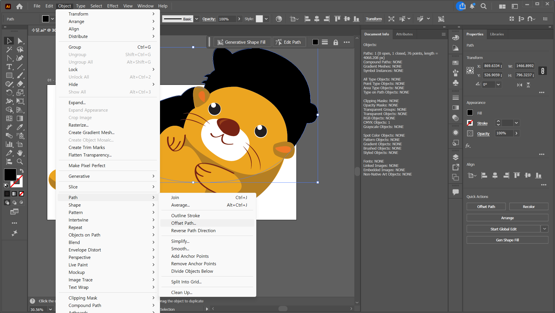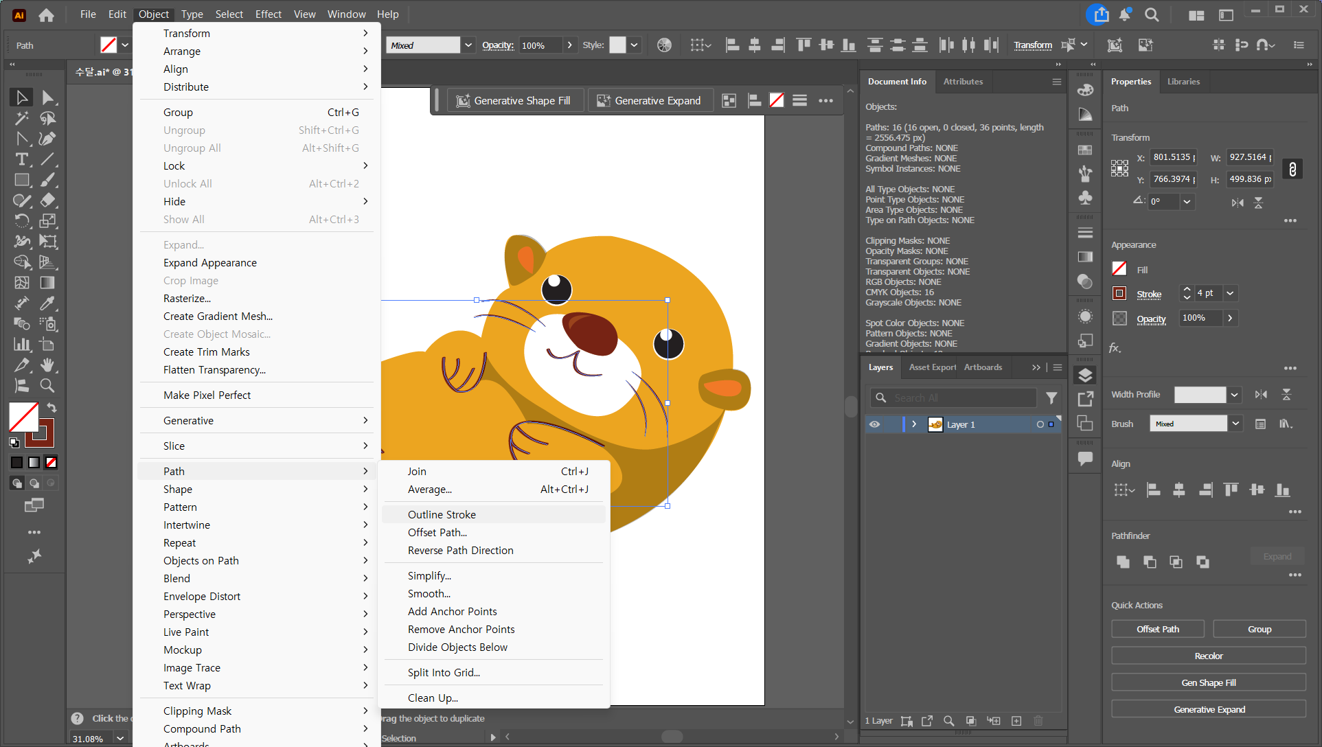 SVG 파일 안에 선(Stroke)이 있으면 안 돼요. Fill(면)으로만 구성해야 해요. 오브젝트(Object) > 패스(Path) > 윤곽선(Outline Stroke)를 적용하면 선 개체가 면이 되지만, 속성이 남아있는 경우가 있으니 마지막에 반드시 확인이 필요합니다.