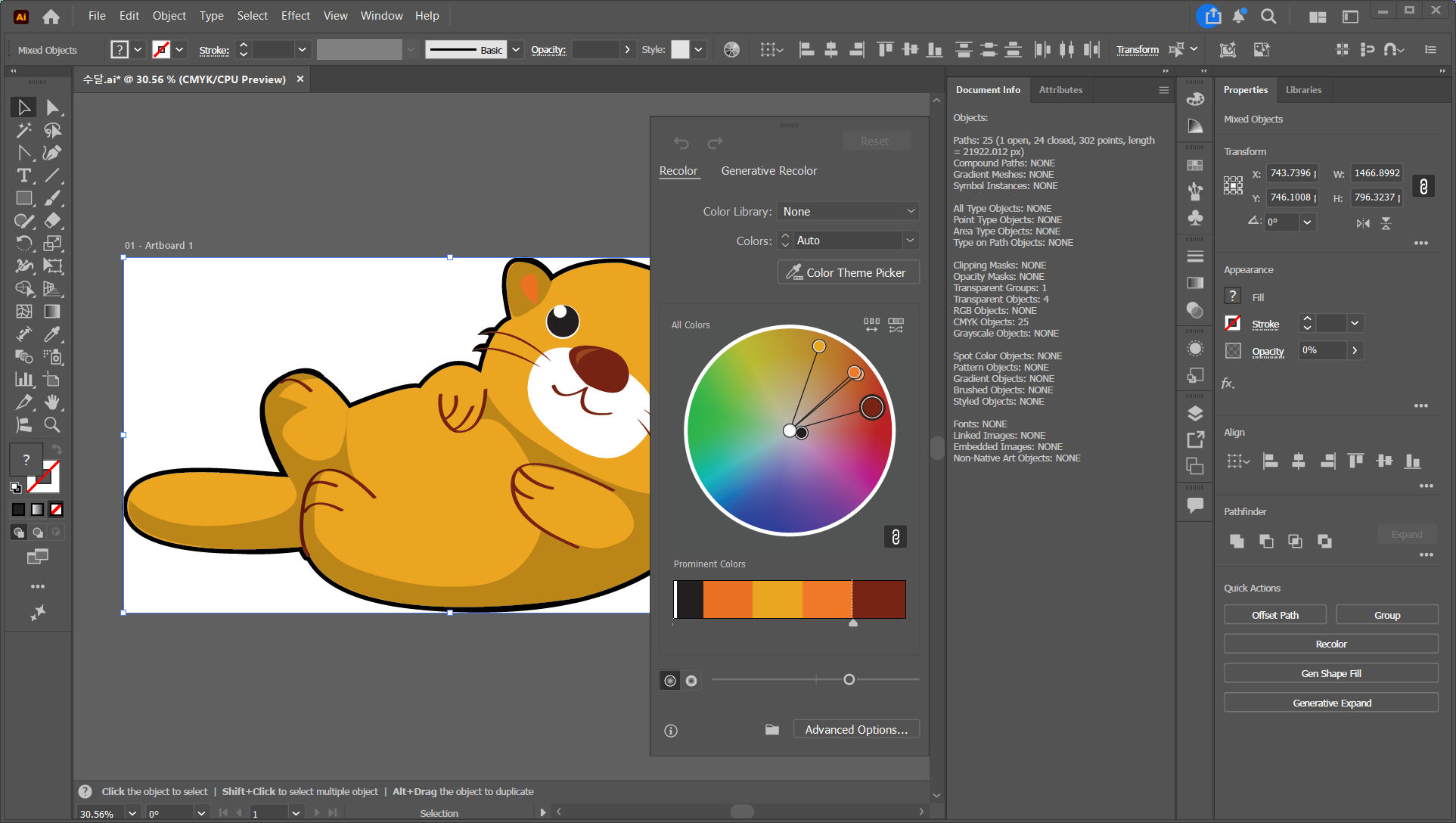 색을 많이 쓸수록 좋을 것 같지만, 미리캔버스 SVG 요소는 색상 5종 이내로 제한하는 것을 권고하고 있습니다. 비슷한 계열은 하나로 통일하는 편이 좋아요. 일러스트레이터에서 색상 개수를 세는 가장 빠르고 정확한 방법은 편집(Edit) > 색상 편집(Edit Colors) > 아트웍 색상 변경(Recolor Artwork)에서 확인하는 방법이 있어요.