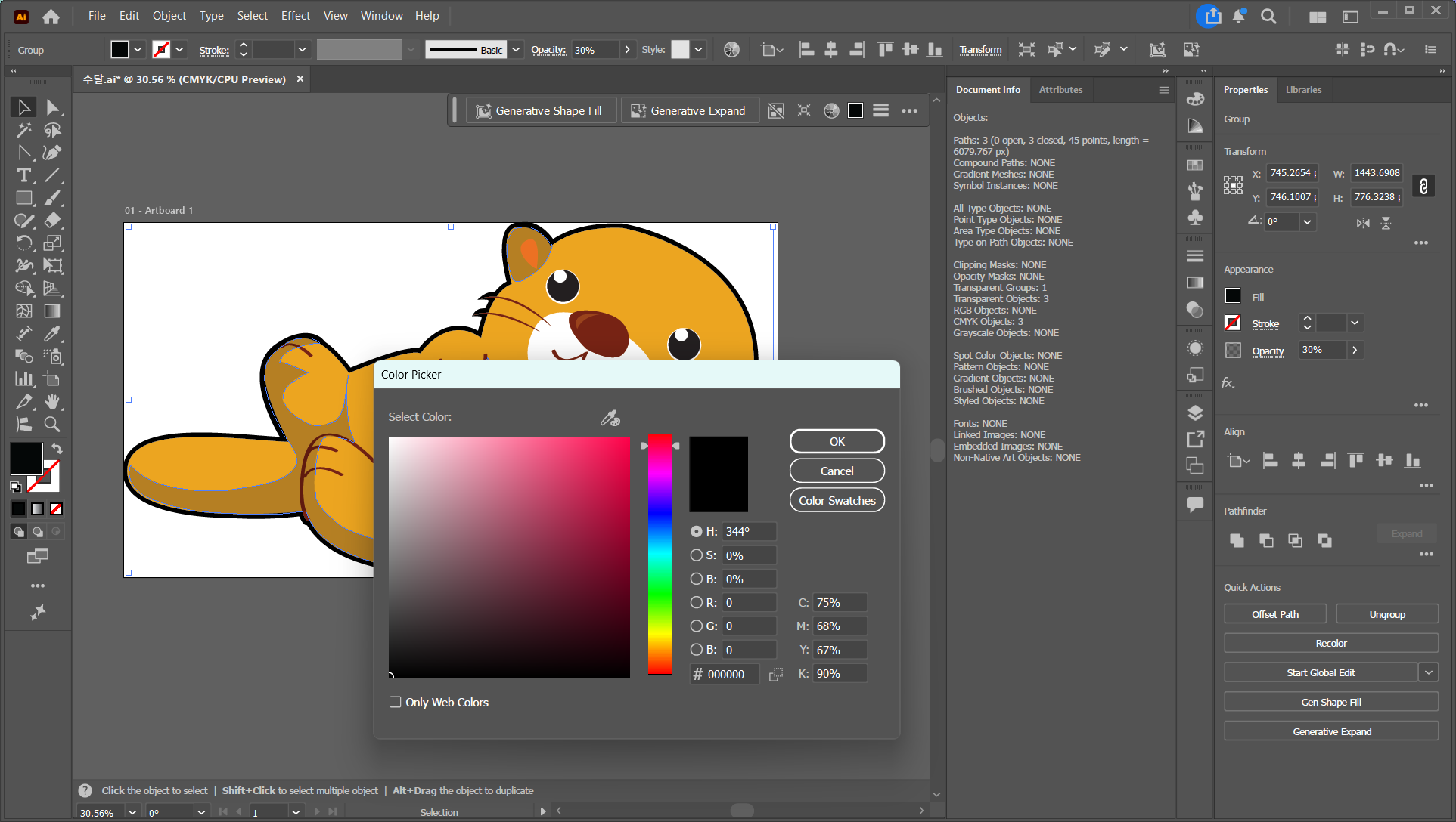일러스트레이터 창 (Window) > 문서 정보 (Document Info) 에서 객체 수를 확인할 수 있어요. 30개가 넘으면 업로드가 안 돼요. 윤곽선(Outline Stroke) 기능을 적용하면 객체가 2배로 늘어나는 경우가 있어서, 이 과정에서 모르고 넘어가는 경우가 많아요.
