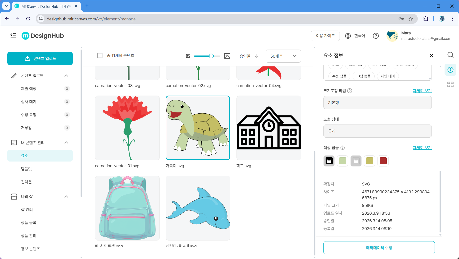 | 업로드한 에셋 | 돌고래, 거북이, 연필, 백팩, 카네이션 시리즈 |