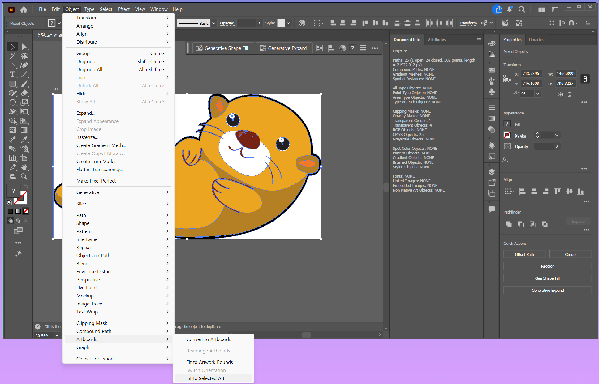 ⑥ 마지막에 개체를 선택하고 Object > Artboards > Ft to Selected Art 로 오브젝트에 아트보드를 맞춰서 잘라주는 것도 중요해요.