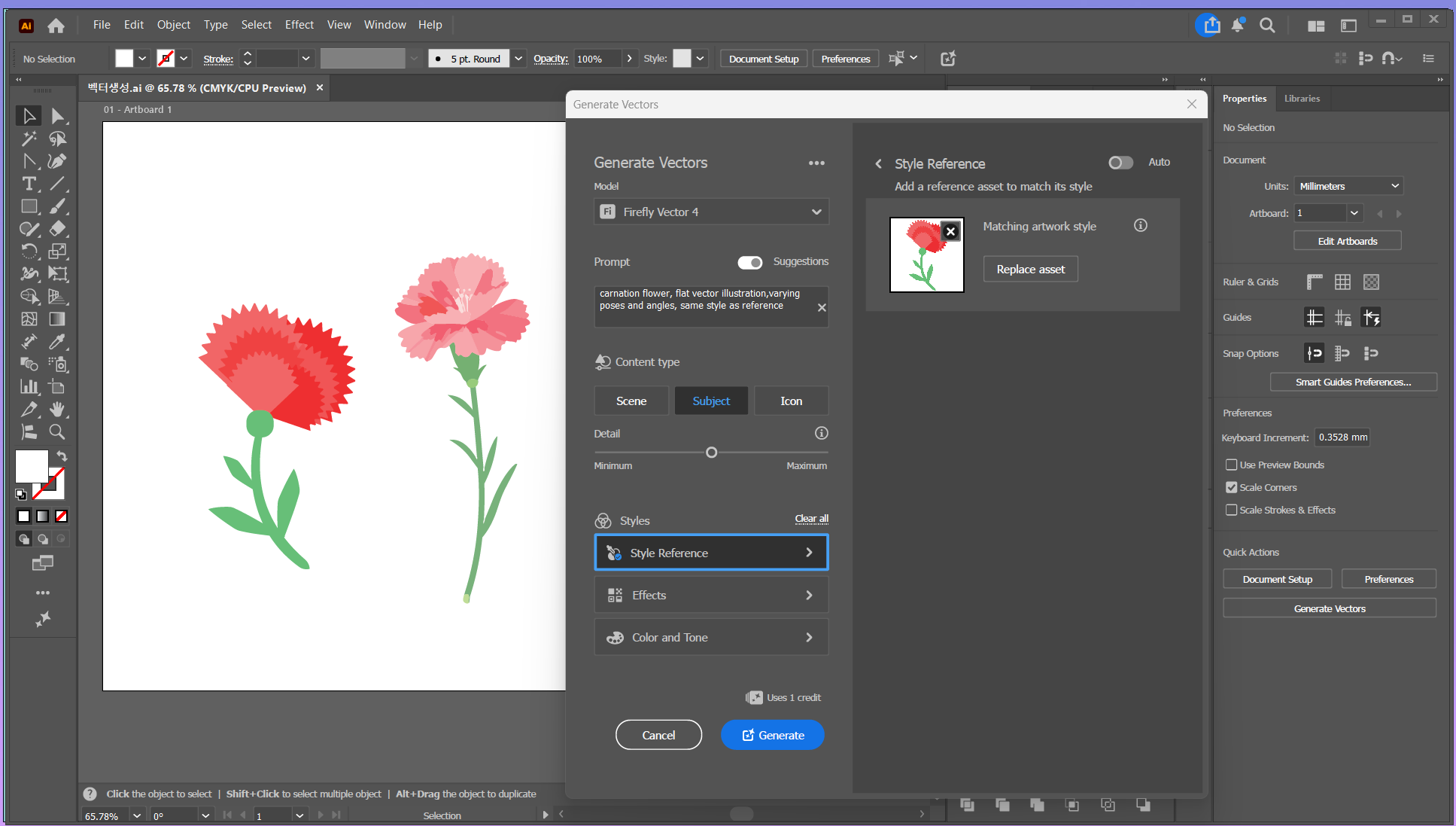 아무것도 선택하지 않은 상태에서 오브젝트(Object) > 생성(Generate) > 벡터 생성(Generate Vectors) 을 선택하여 벡터 생성 창을 열어요. 모델을 Firefly vector 4로 설정하고, 스타일 레퍼런스에 방금 그린 요소를 레퍼런스로 지정한 다음 프롬프트를 입력해서 이미지를 생성해요. 깔끔하게 새로운 벡터 이미지를 생성해 줍니다.