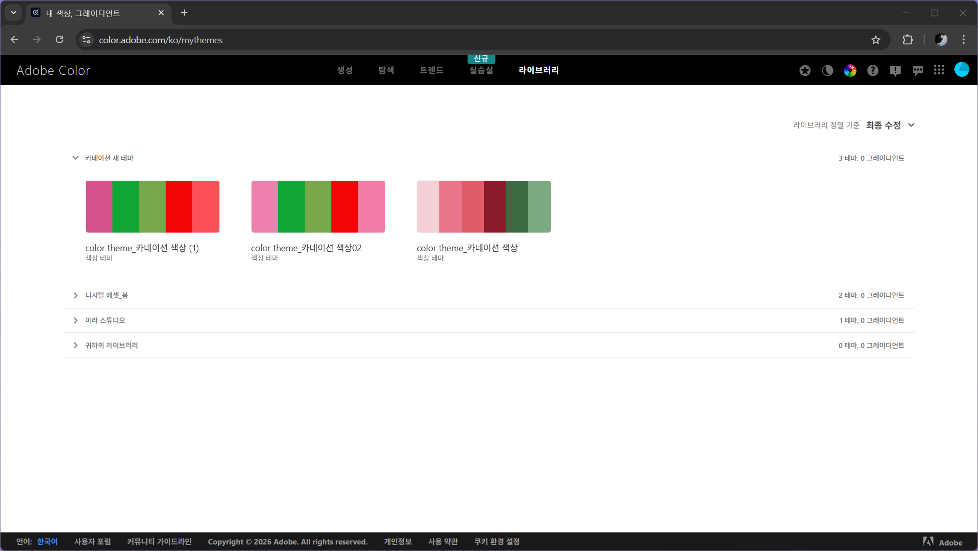 색상 팔레트는 어도비 Color에서 먼저 만들고, .ase 파일로 저장해서 일러스트레이터와 포토샵에 동시에 불러오면 헥스코드(Hex Code) 타이핑 없이 클릭 한 번으로 같은 색을 쓸 수 있어요.