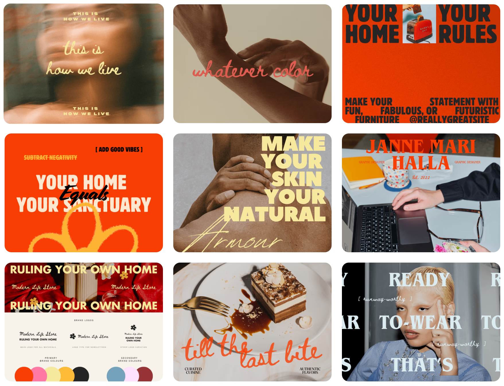 모듈식의 스타일은 굵은 모양을 사용하여 구조를 만들고, 역광 사진과 따뜻한 색상으로 친근한 느낌을 부여하는 것입니다. 볼드한 모양, 백라이트 사진, 따뜻한 색감이 조화를 이루며 기능성과 감각을 동시에 제공합니다. 모양 shapes 키워드는 56% 검색이 증가하였고 모듈러 modular 키워드는 23% 증가했다고 합니다.