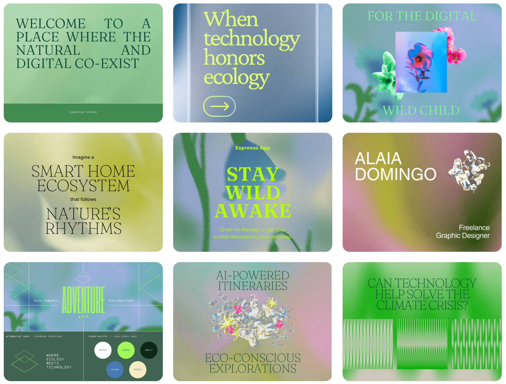 이 트렌드는 자연과 기술을 융합하여 유기성과 공학성이 만나는 조화를 꾀합니다. 세련된 디지털 요소와 자연스러운 질감, 흙빛 색상을 결합하여 미래적이면서도 현실적인 모습을 연출합니다. 테크노 techno 키워드가 30% 증가, 사이버 cyber 키워드는 32% 검색량이 증가하였다고 합니다.