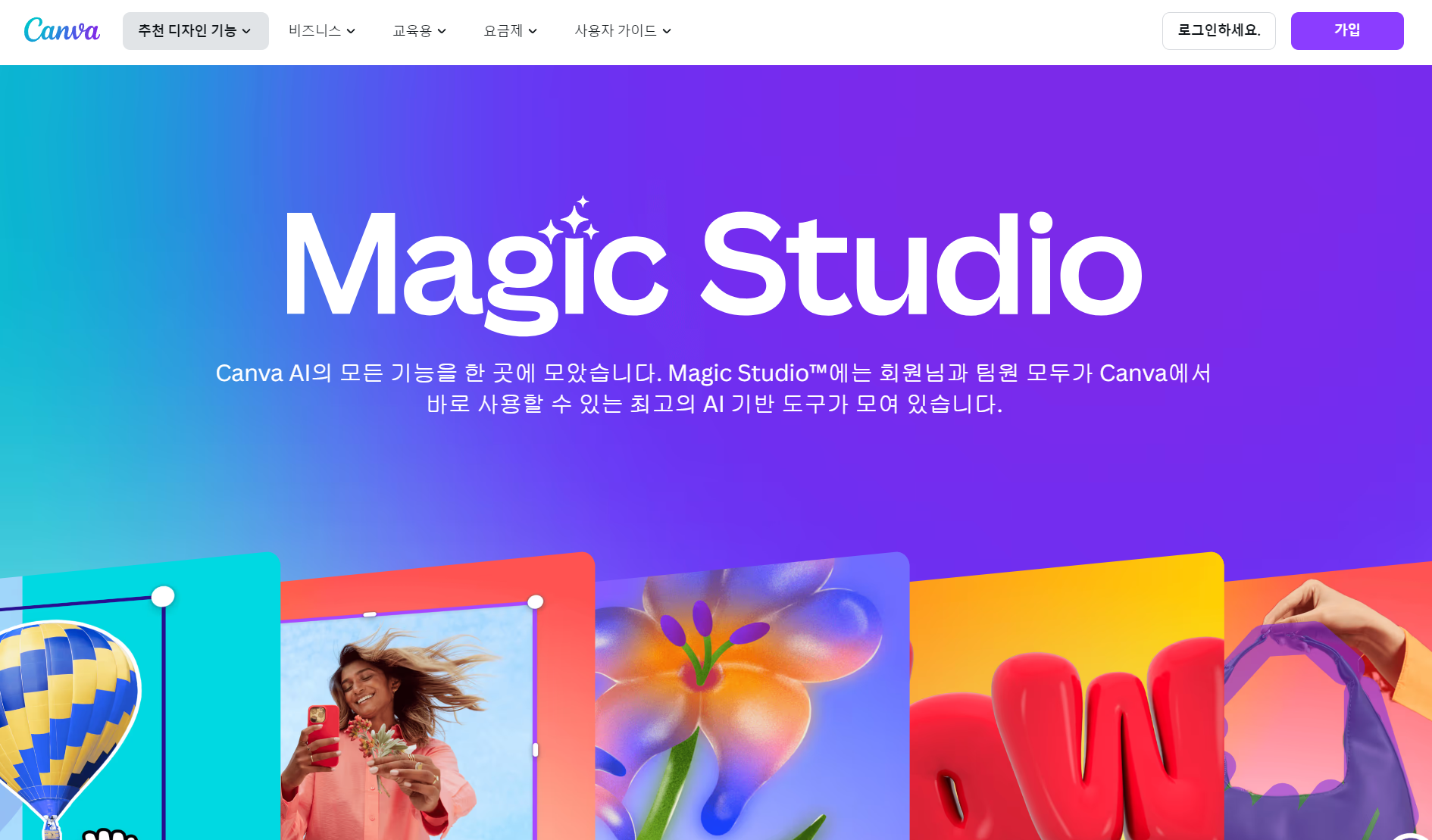 Canva는 AI 기능을 통해 디자인 작업을 효율적이고 창의적으로 도와주는 웹 기반 그래픽 디자인 도구입니다. 주요 AI 기능으로는 디자인 제안 및 자동 크기 조정, 자동 배경 제거, 색상 팔레트 제안, Magic Design, AI 디자인 어시스턴트, Magic Studio AI, 애니메이션 및 GIF 생성, AI 동영상 생성기가 있습니다. 무료 버전을 제공하며, Pro(14,000원), Teams(11,000원), Enterprise(문의 필요) 유료 패키지를 제공합니다. 캔바의 장점으로는 사용하기 쉬운 편집기, 다양한 템플릿, 무료 버전 제공, 뛰어난 배경 제거 기능이 있으며, 단점으로는 일부 AI 도구를 사용하려면 프리미엄 구독이 필요하다는 점을 들 수 있습니다.