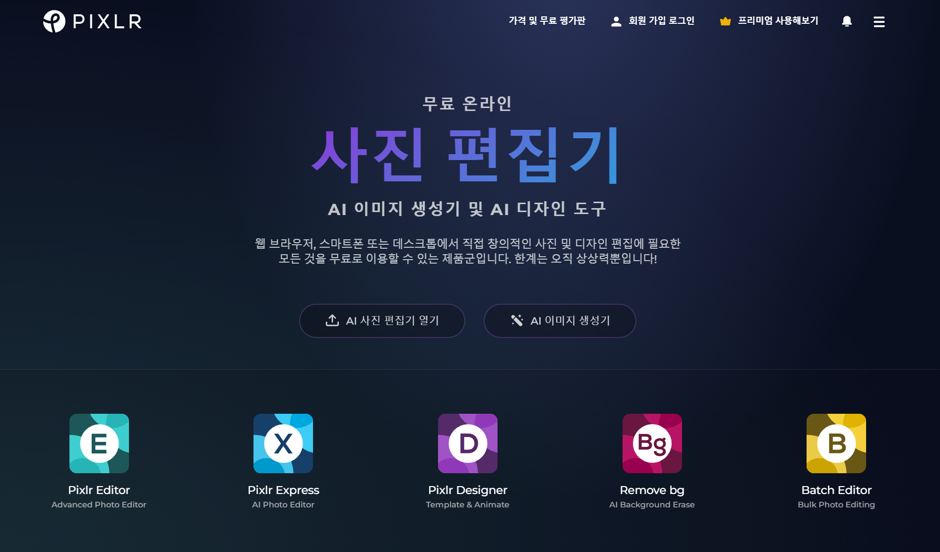 Pixlr은 사용자가 웹 브라우저, 스마트폰 또는 데스크톱에서 직접 창의적인 사진 및 디자인 편집을 할 수 있는 다양한 AI 기능을 갖춘 온라인 사진 편집기입니다. Pixlr은 스마트 컷아웃, 원클릭 효과 등 AI 기반 기능을 갖춘 강력한 사진 편집 기능을 제공하여 디자이너가 정확하고 쉽게 캠페인 이미지를 향상시킬 수 있도록 지원합니다. 주요 AI 기능으로는 AI 이미지 생성기, AI 배경 제거, AI 객체 제거, AI 얼굴 바꾸기, AI 슈퍼 스케일, AI 슈퍼 샤프, AI 제너레이티브 변형, AI 노이즈 제거 등이 있습니다. Pixlr은 기본적으로 무료로 제공되며, 추가 기능이나 AI 크레딧이 필요한 경우 월 $1.99부터 시작하는 구독 요금제를 선택할 수 있습니다. Pixlr의 장점으로는 사용자 친화적인 인터페이스, 레이어 및 마스크 지원, 무료 AI 도구 제공, 비용 효율성 등이 있으며, 단점으로는 무료 버전에서 광고가 표시되고, 템플릿 컬렉션이 주로 소셜 미디어 기반으로 구성되어 있다는 점이 있습니다.