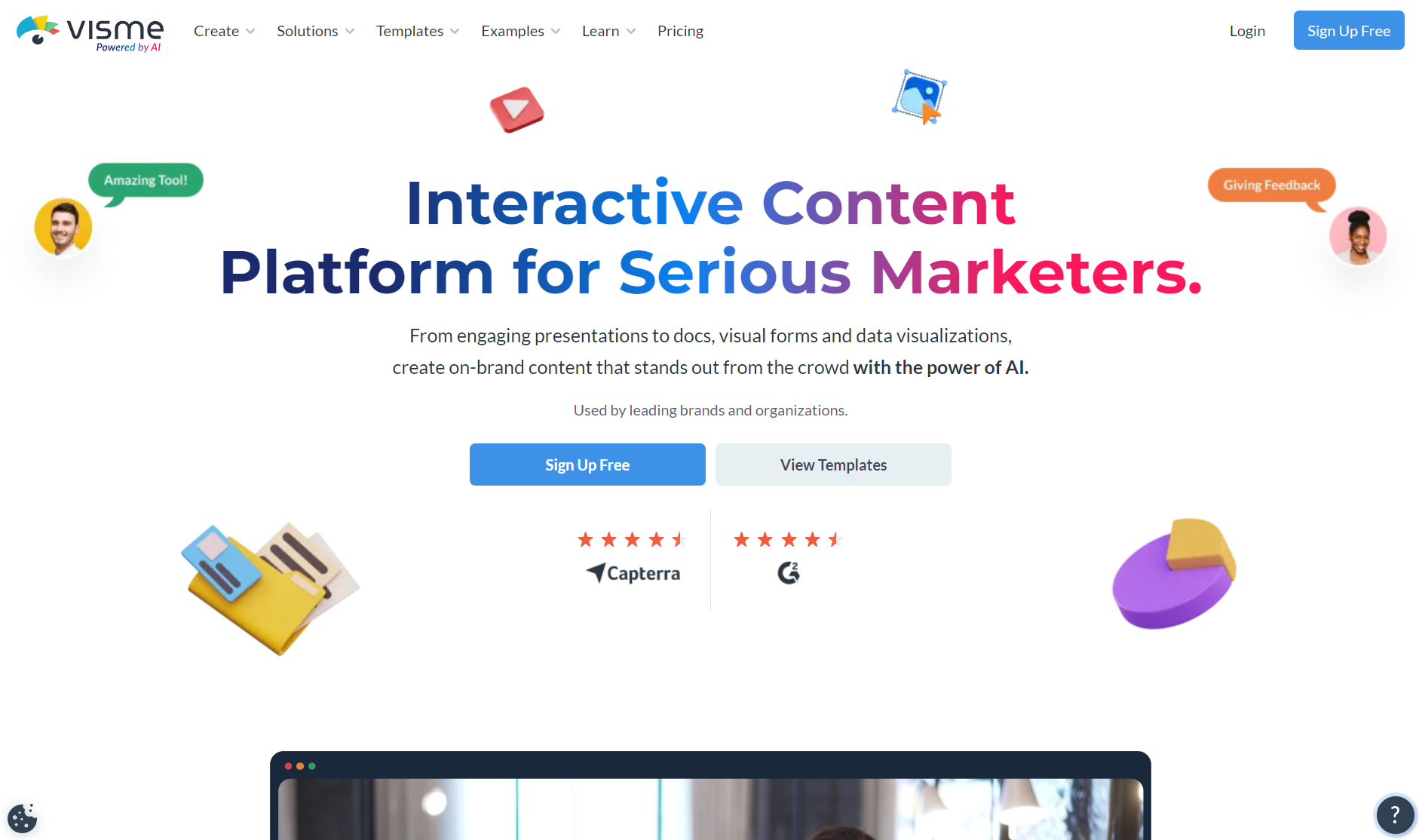 Visme 는 텍스트 프롬프트를 기반으로 그래픽을 만드는 AI 기반 도구를 제공합니다. 주요 AI 기능으로는 AI 디자이너, AI 프레젠테이션 메이커, AI 문서 생성기, AI 브랜드 디자인 도구, AI 이미지 생성기 및 AI 텍스트 생성기가 있습니다. Visme의 가격 정책은 유연하며, 무료 플랜부터 시작하여 필요에 따라 업그레이드할 수 있는 여러 유료 플랜을 제공합니다. 유료 플랜은 추가 기능과 더 많은 템플릿, 그리고 고급 사용자 지원을 포함합니다. 장점으로는 사용자 친화적인 인터페이스, 다양한 템플릿, 다른 도구와의 통합, 협업 기능 등이 있습니다. 이는 사용자가 다양한 디자인 요구사항을 쉽게 충족시킬 수 있게 해줍니다. 단점으로는 전문가를 위한 고급 디자인 기능의 제한과 새로운 사용자에게는 약간의 학습 곡선이 있을 수 있다는 점입니다. 또한, 전체 기능에 접근하기 위해서는 유료 구독이 필요하다는 점을 들 수 있습니다.