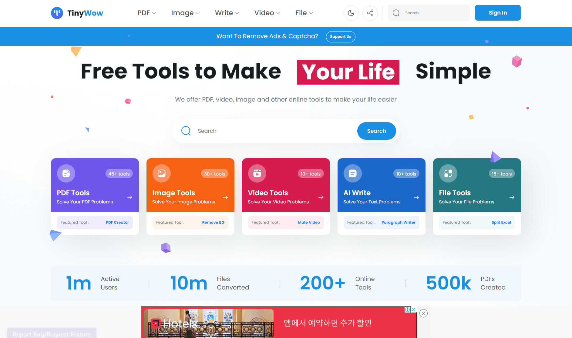 TinyWow는 파일 변환, PDF 처리, 이미지 및 비디오 편집 등 150개 이상의 도구를 제공하는 다목적 온라인 플랫폼입니다. 사용자 친화적인 인터페이스와 무료 서비스가 특징이며, 프리미엄 플랜을 통해 광고 없이 더 많은 기능을 이용할 수 있습니다. TinyWow의 가격 정책은 기본적으로 무료이며, 월 $5.99 또는 연 $49.99의 프리미엄 플랜을 선택할 수 있습니다. 장점으로는 다양한 도구 제공, 쉬운 사용법, 높은 호환성, 개인정보 보호 등이 있으며, 단점으로는 인터넷 연결 필요, 고급 기능 제한, 데스크탑 앱 부재 등을 들 수 있습니다.