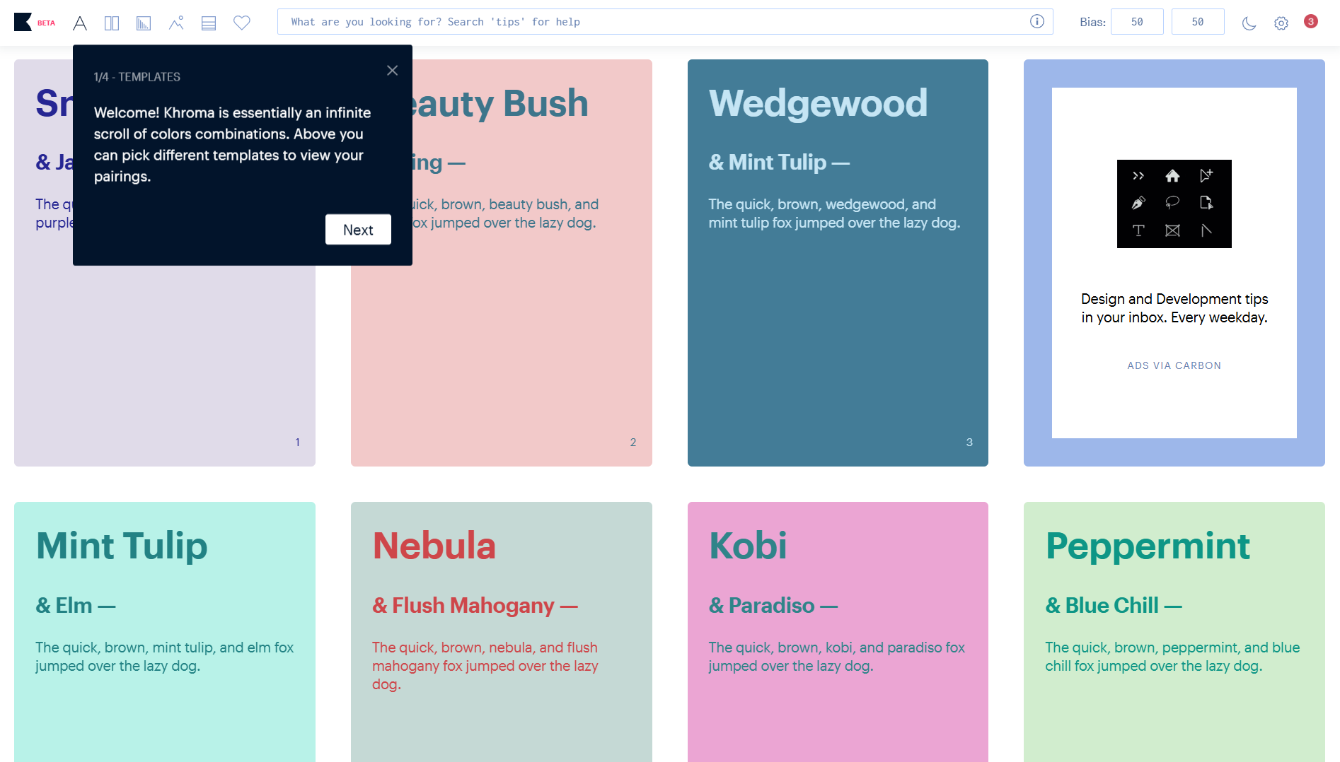Khroma는 여러분의 색상 취향을 학습하는 AI 도구입니다. 초기에 50개의 색상 중 마음에 드는 것을 선택하면, AI가 사용자의 취향을 분석하여 무한한 맞춤형 팔레트를 생성합니다. 최신 트렌드를 학습하여 시즌별 컬렉션을 제안하기도 합니다.