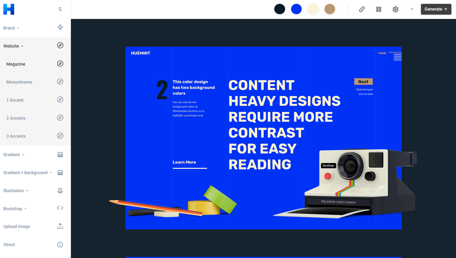 Huemint는 디자인 목적과 색상 수에 따라 팔레트를 생성하는 강력한 도구입니다. 선택한 색상을 고정하고 나머지를 AI가 생성하게 하거나 완전히 새로운 조합을 만들 수 있습니다. 브랜딩, UI/UX, 일러스트레이션 등 프로젝트 유형에 따라 최적화된 색상 조합을 제안합니다. 실제 웹사이트 등 현실 세계에 적용되었을 때 어떻게 보일지 보여주어 브랜딩에 활용하기 좋습니다.