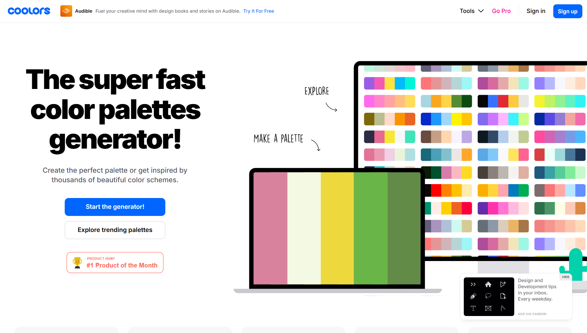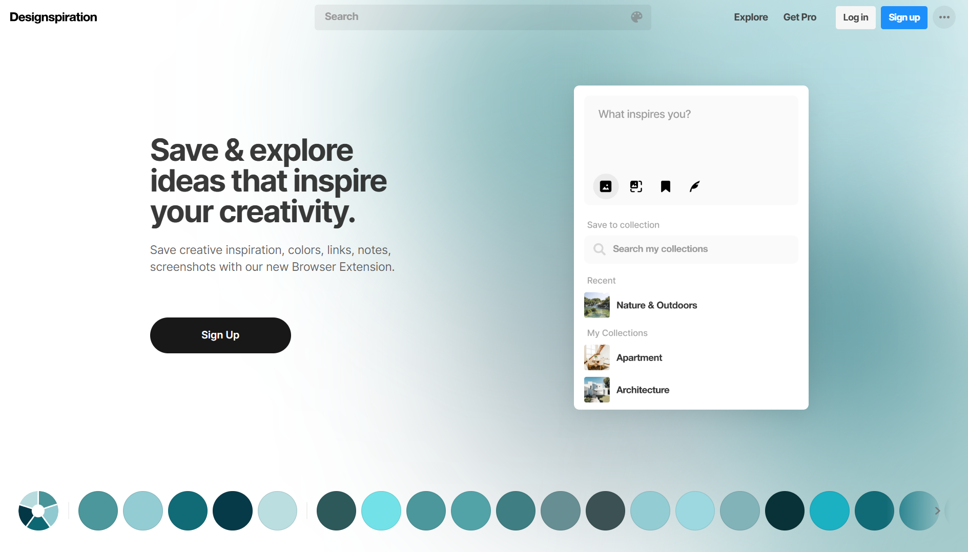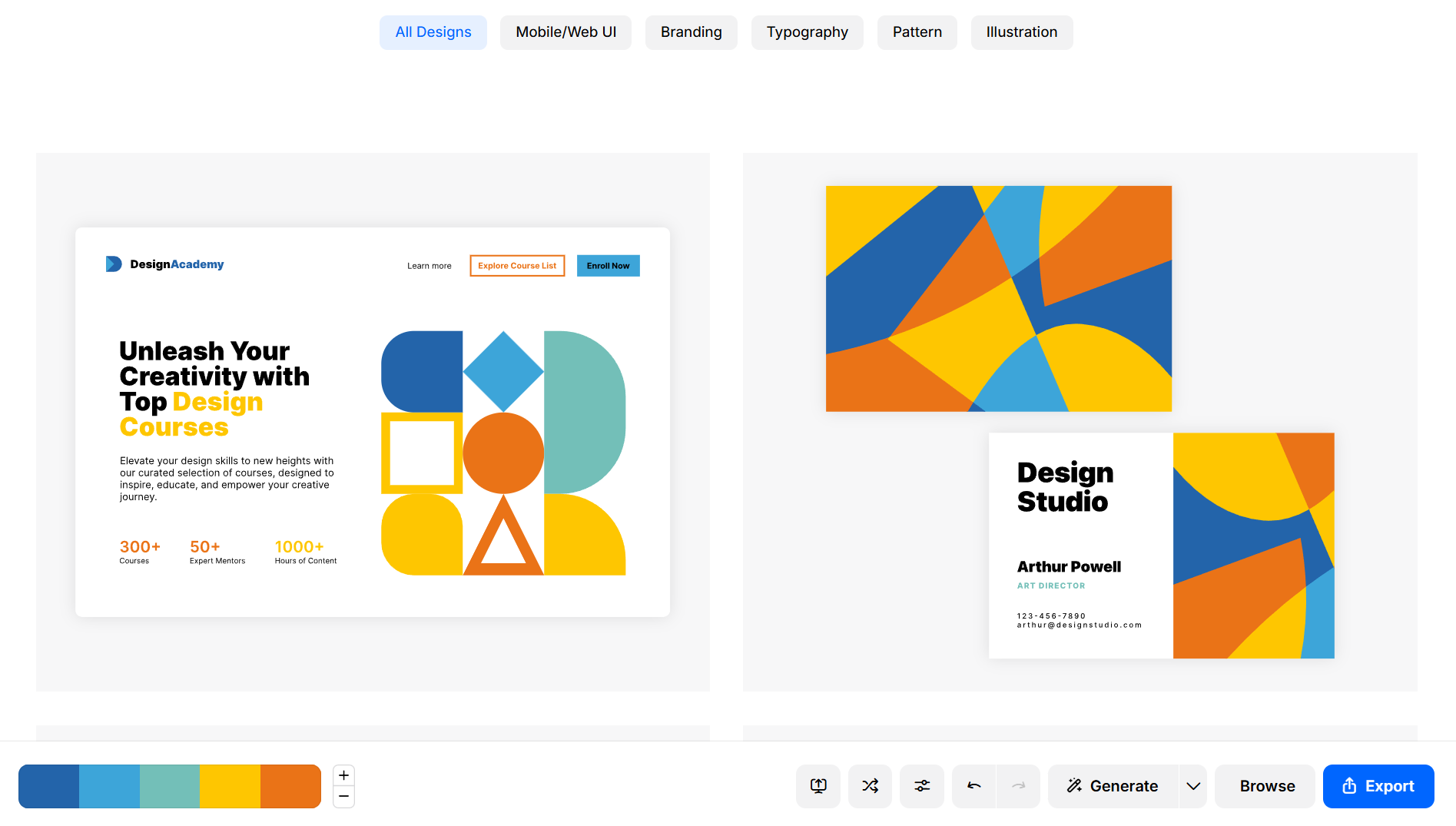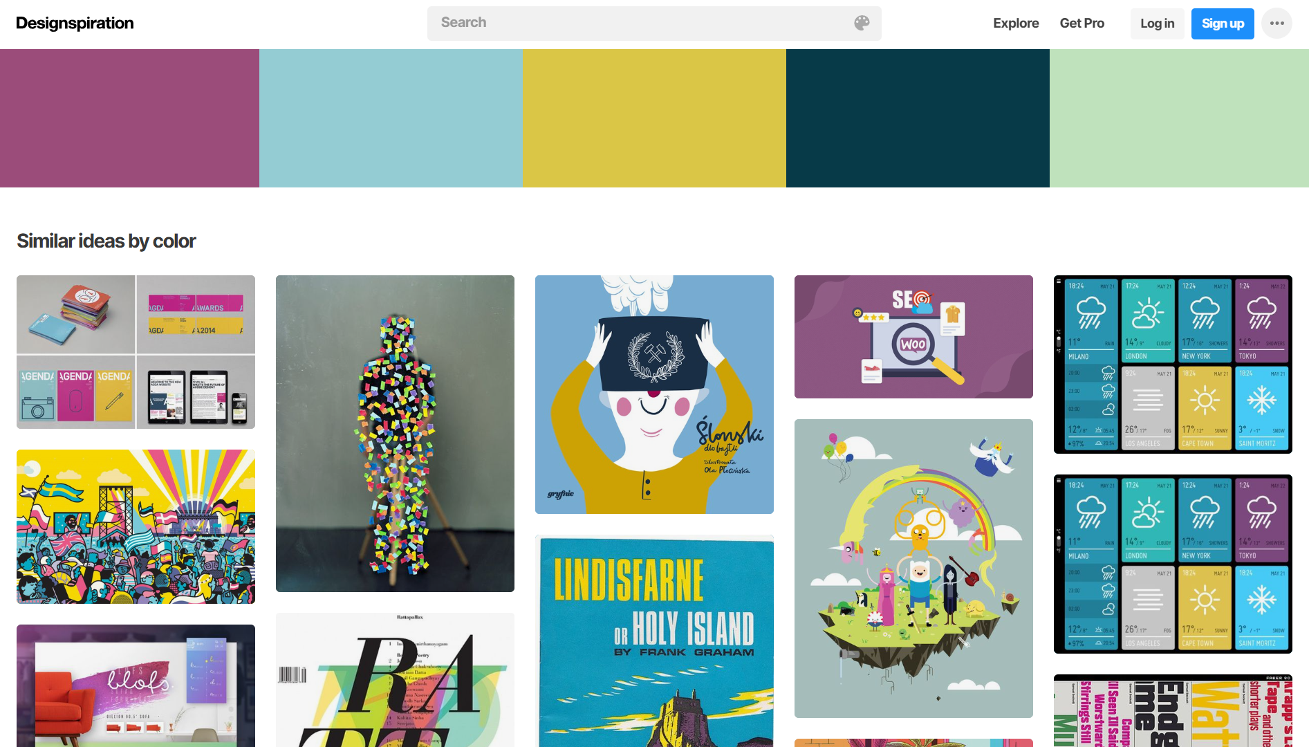 Designspiration 은 선택한 색상 팔레트가 실제 디자인에서 어떻게 사용되는지 영감을 얻을 수 있는 도구입니다. 최대 5가지 색상을 선택하면 해당 팔레트를 사용한 다양한 디자인 및 스톡 사진을 탐색할 수 있습니다.