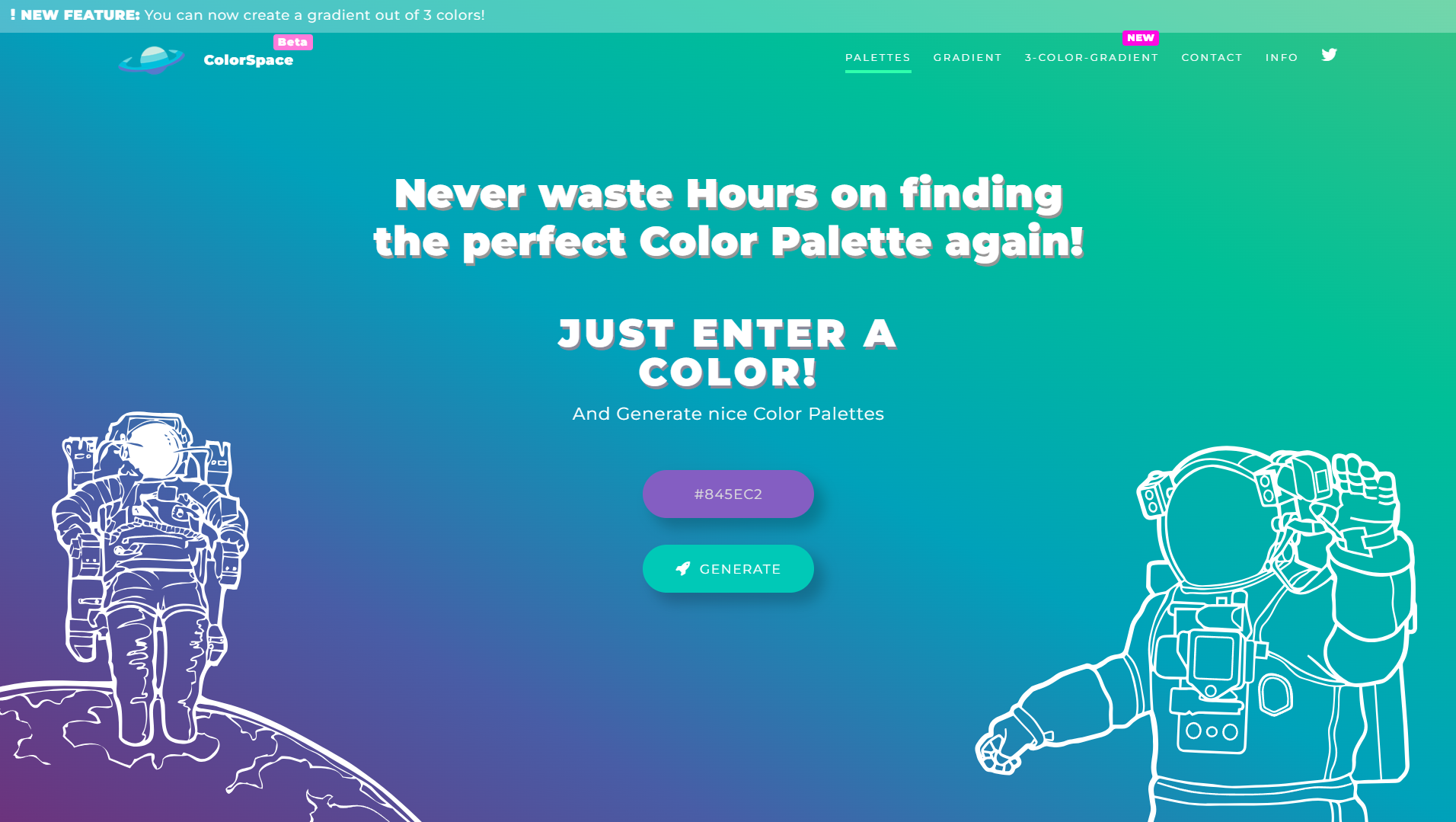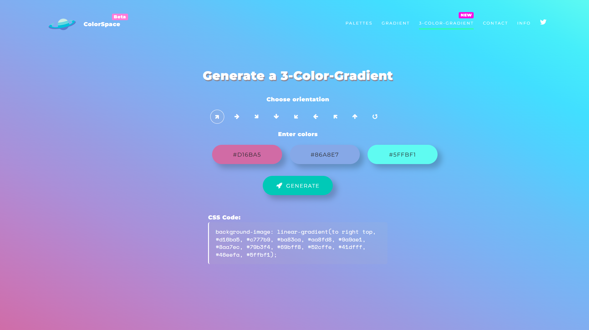 활용법: ColorSpace의 가장 큰 장점은 단일 색상으로 수십 가지 다양한 팔레트를 생성할 수 있다는 점입니다. 메인 페이지에서 색상을 직접 입력하거나 색상 선택기를 사용해 원하는 색상을 설정하세요. 'Generate' 버튼을 클릭하면 입력한 색상을 기반으로 다양한 조화로운 팔레트들이 생성됩니다. 각 팔레트는 다른 색상 이론(보색, 유사색, 트라이아드 등)을 기반으로 하므로 프로젝트의 성격에 맞는 것을 선택할 수 있습니다. 상단 메뉴의 'Gradient' 기능을 사용하면 두 색상 간의 그라데이션을 만들 수 있고, '3-Color-Gradient' 기능으로는 세 가지 색상으로 구성된 복합 그라데이션도 생성할 수 있습니다. 생성된 모든 색상과 그라데이션은 CSS 코드로 제공되어 웹 개발에 바로 활용할 수 있습니다. 인터페이스가 매우 간단해서 색상 이론에 대한 지식 없이도 쉽게 전문적인 색상 조합을 만들 수 있는 것이 큰 장점입니다.