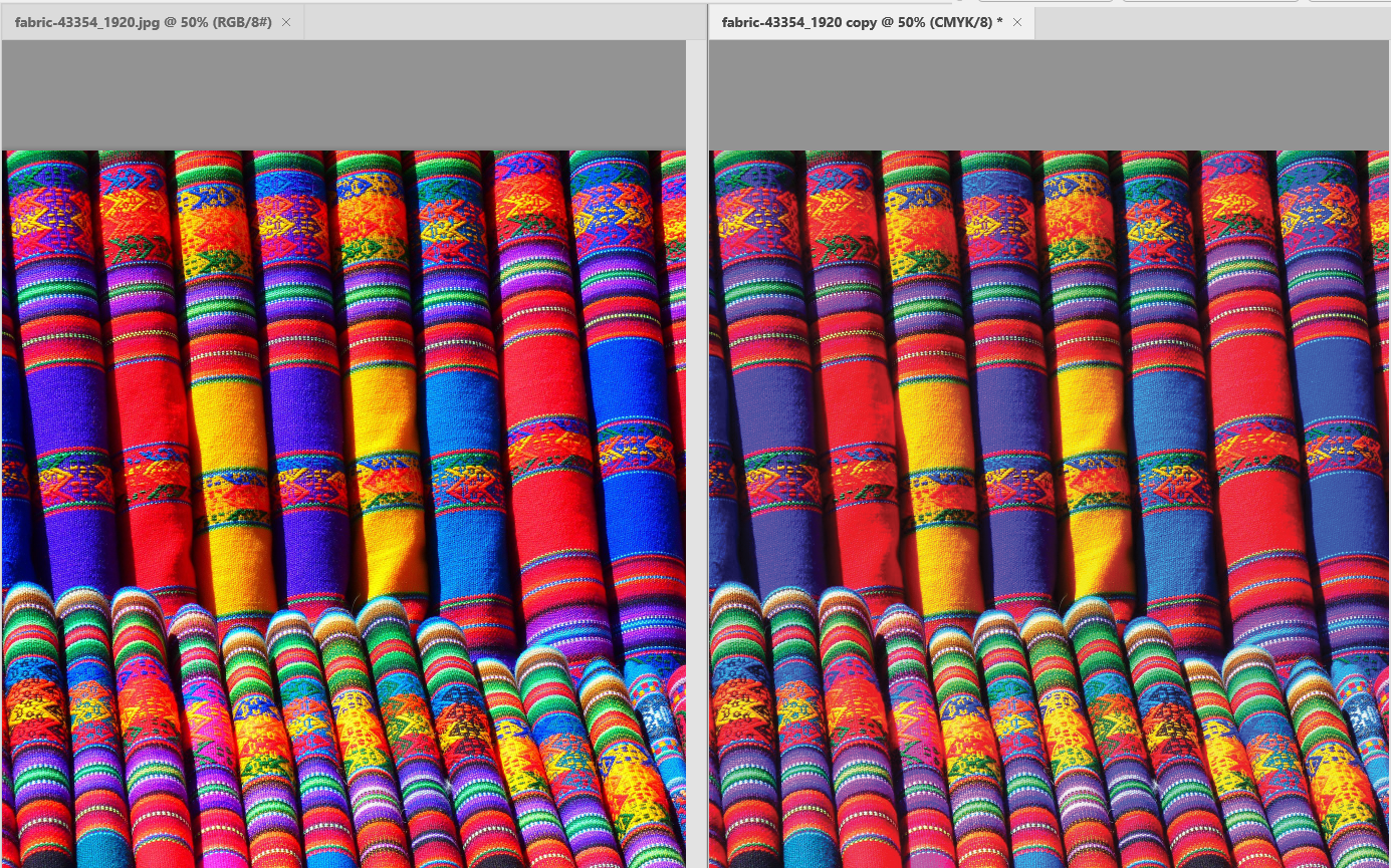- 디스플레이 화면은 RGB 색상 체계, 인쇄는 CMYK 색상 체계를 사용하며 CMYK가 상대적으로 탁하게 보입니다