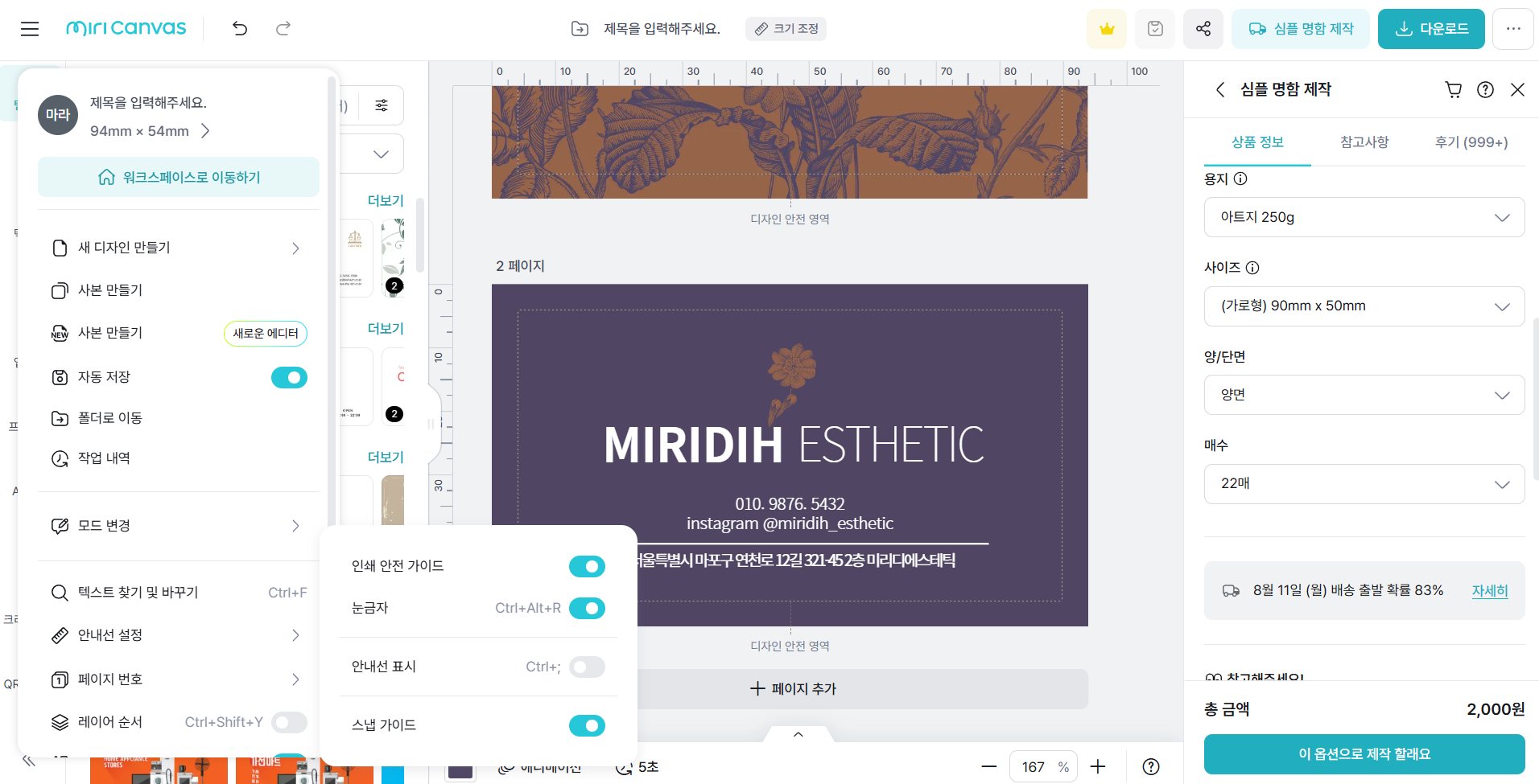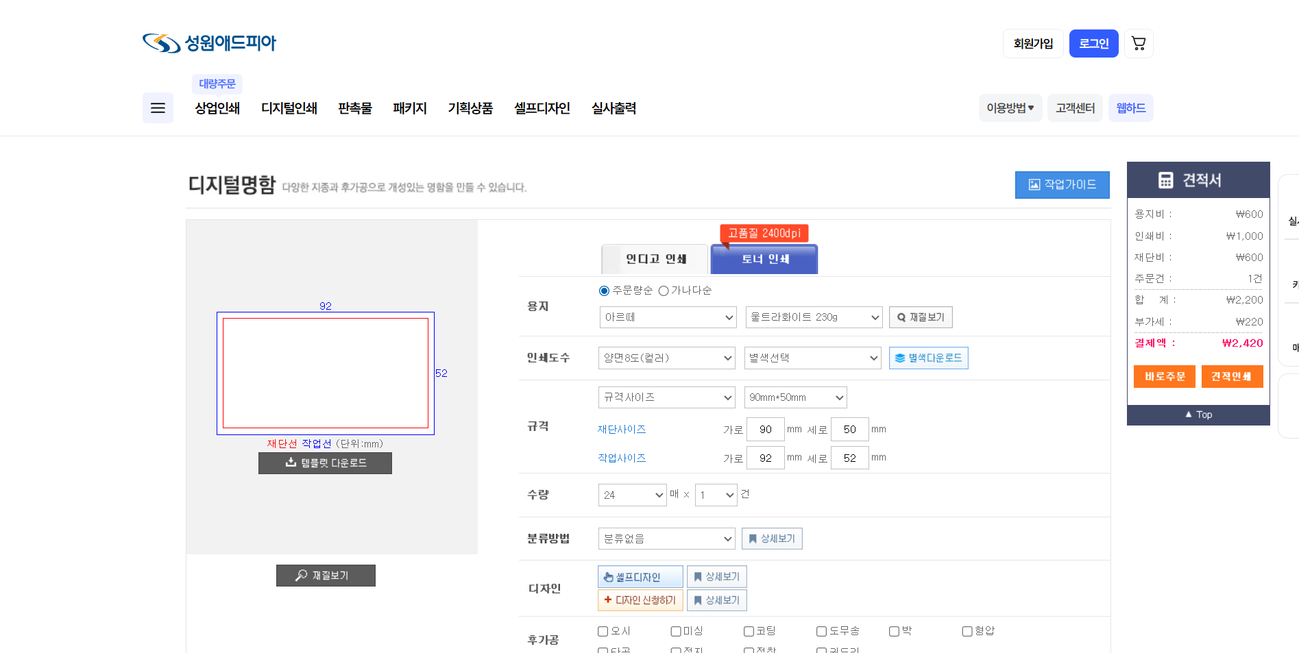 - 선택한 용지 종류와 후가공 옵션(코팅, 박, 형압 등) 재점검