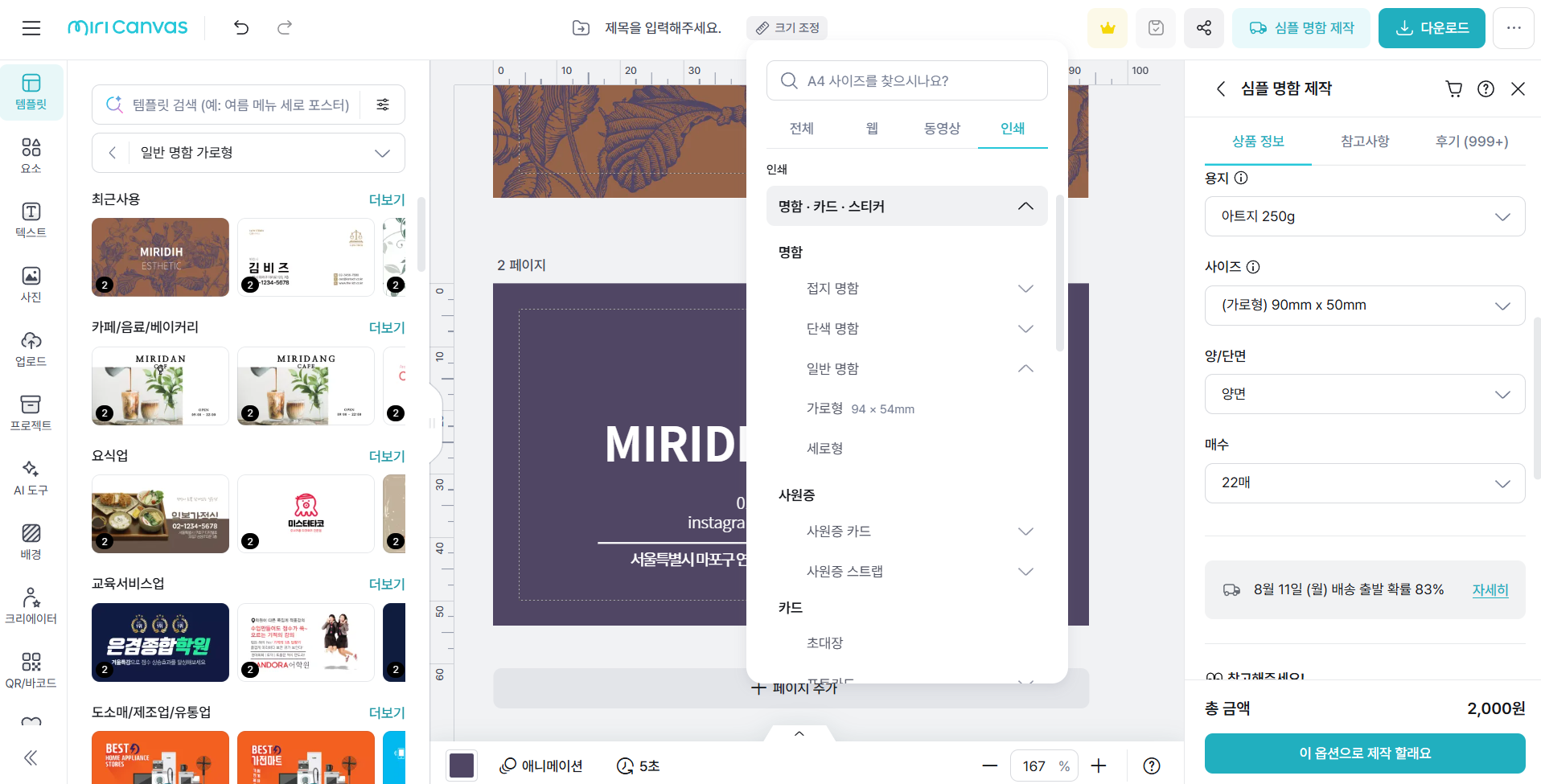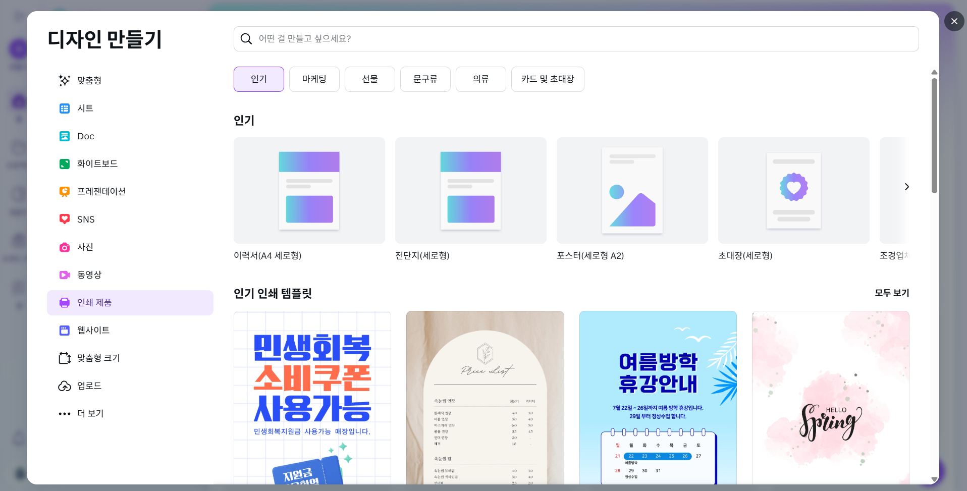 2단계: 템플릿 선택 및 사이즈 설정