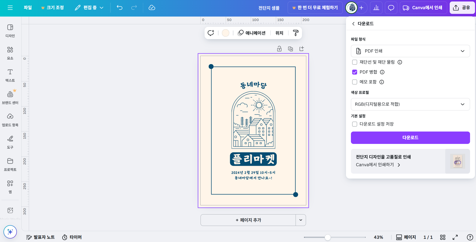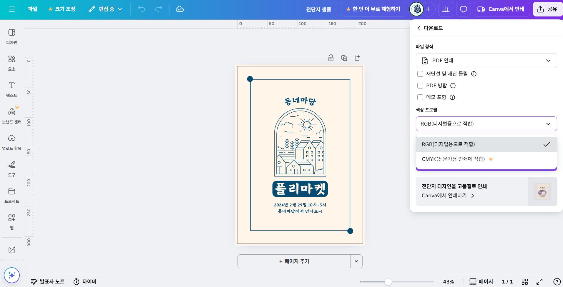실행 팁: 템플릿 도구의 '인쇄용 PDF' 다운로드 기능을 활용하면 CMYK 변환과 고해상도 저장이 자동으로 처리됩니다.