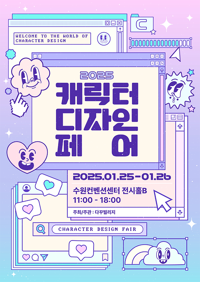 캐릭터디자인페어는 모든 캐릭터와 디자인이 경력과 실력, 인기와 상관없이 사랑받는 자리를 마련하고자 기획된 전시회입니다. 참가비 부담을 낮추고 심사 제도를 폐지하여 1차 창작품이 있다면 누구나 참여할 수 있도록 문턱을 낮춘 것이 특징입니다.