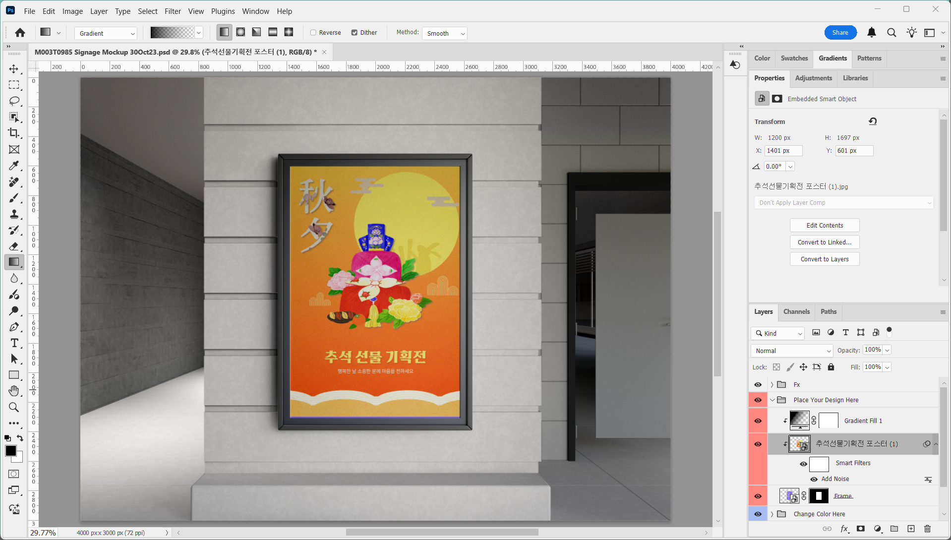 - 스마트 오브젝트 활용: 다운로드한 목업 PSD 파일 열기 → 스마트 오브젝트 레이어 더블클릭 → 디자인 삽입 → 저장