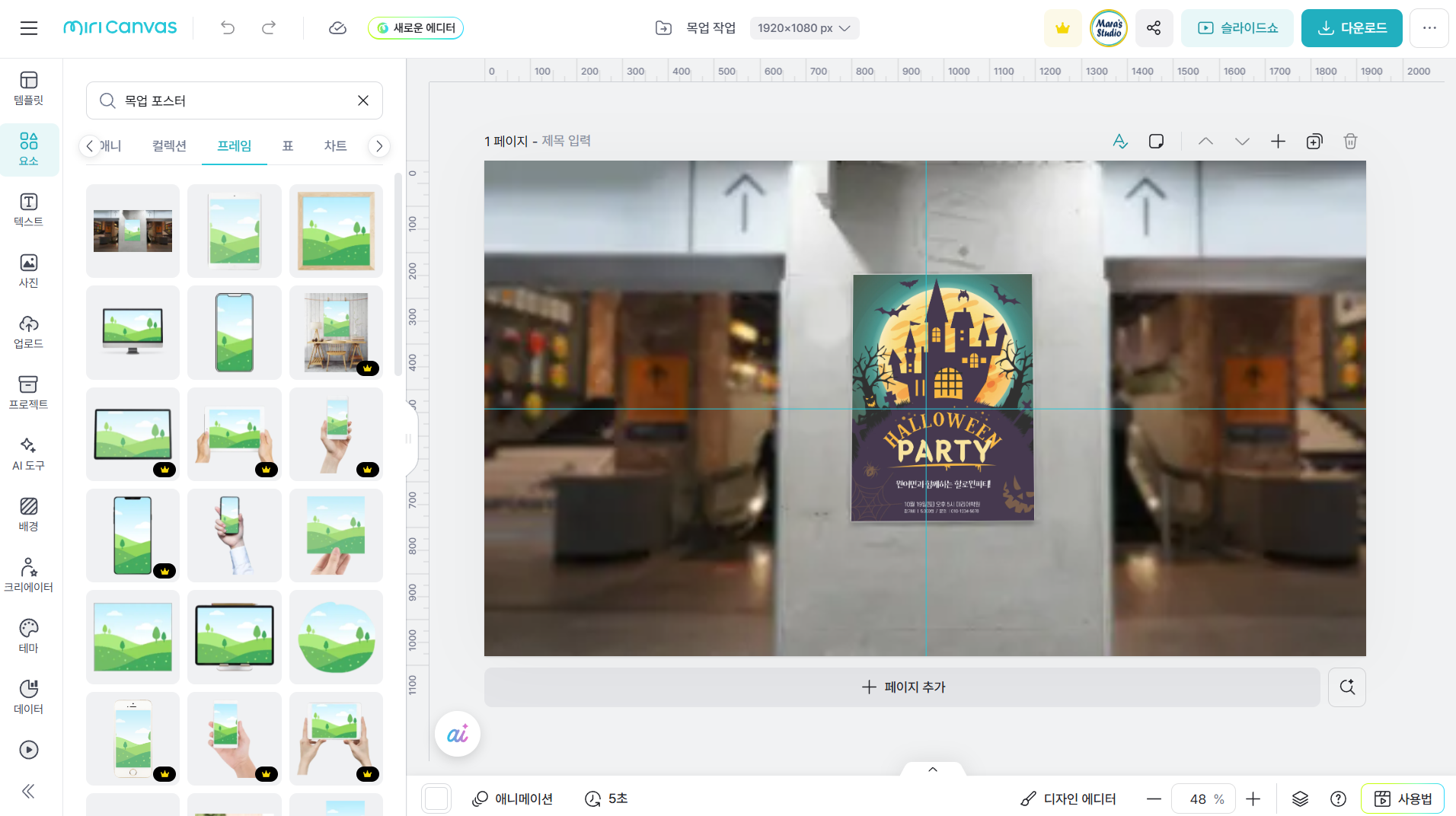 - 요소 메뉴 활용: 작업화면 왼쪽의 '요소' 메뉴에서 디자인 결과물의 용도에 따라 "mockup poster" 또는 "phone mockup" 등의 키워드로 검색하면 개별 목업 이미지를 찾을 수 있습니다. 원하는 템플릿을 선택하여 작업화면에 적용합니다.