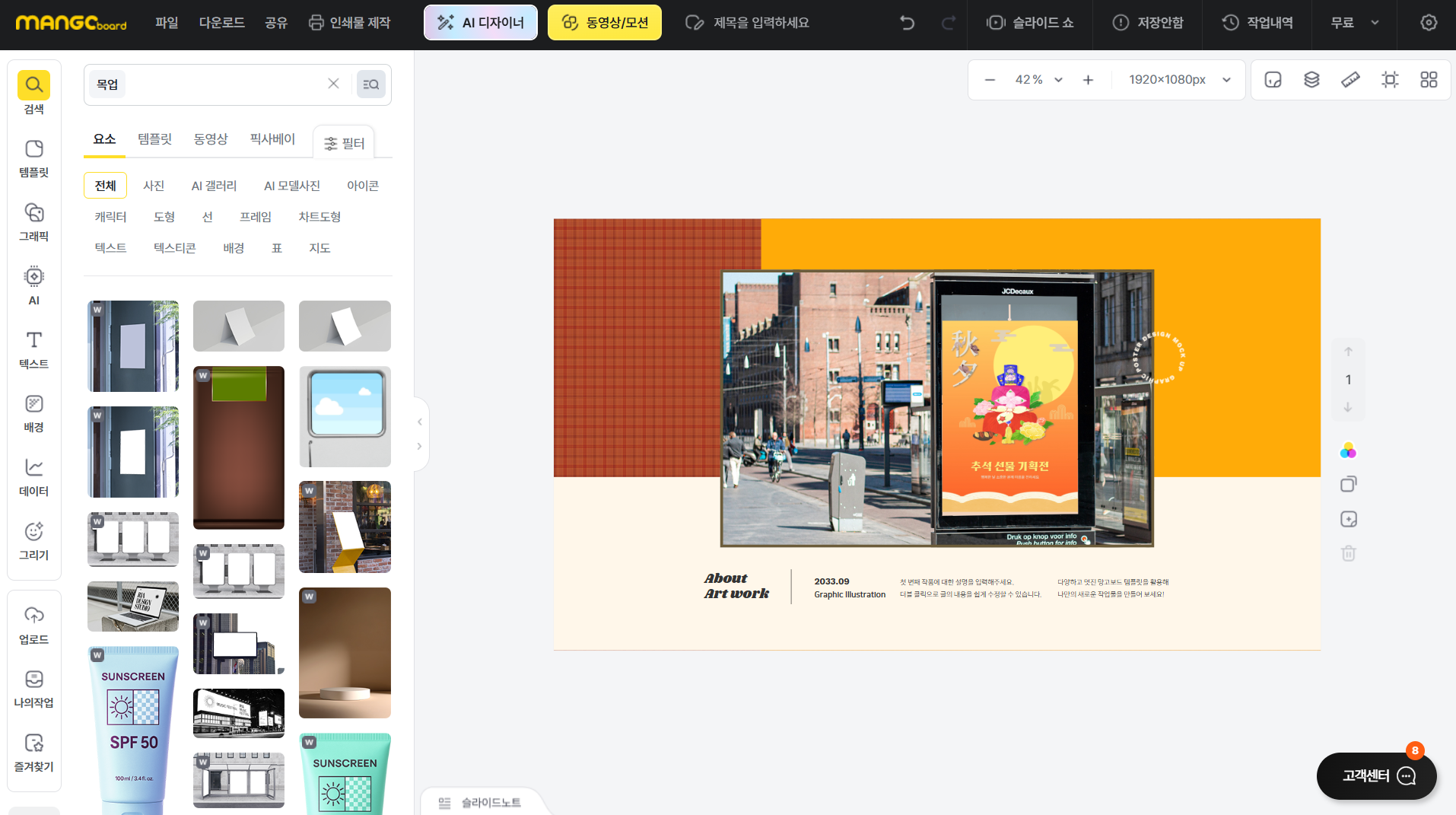 - 요소 메뉴 활용: 작업화면 왼쪽의 '요소' 메뉴에서 디자인 결과물의 용도에 따라 "mockup poster" 등 으로 검색하면 '디자인 에셋' 항목에서 개별 디자인에 맞는 목업 이미지를 찾을 수 있습니다. 원하는 이미지를 선택하여 작업화면에 적용합니다.