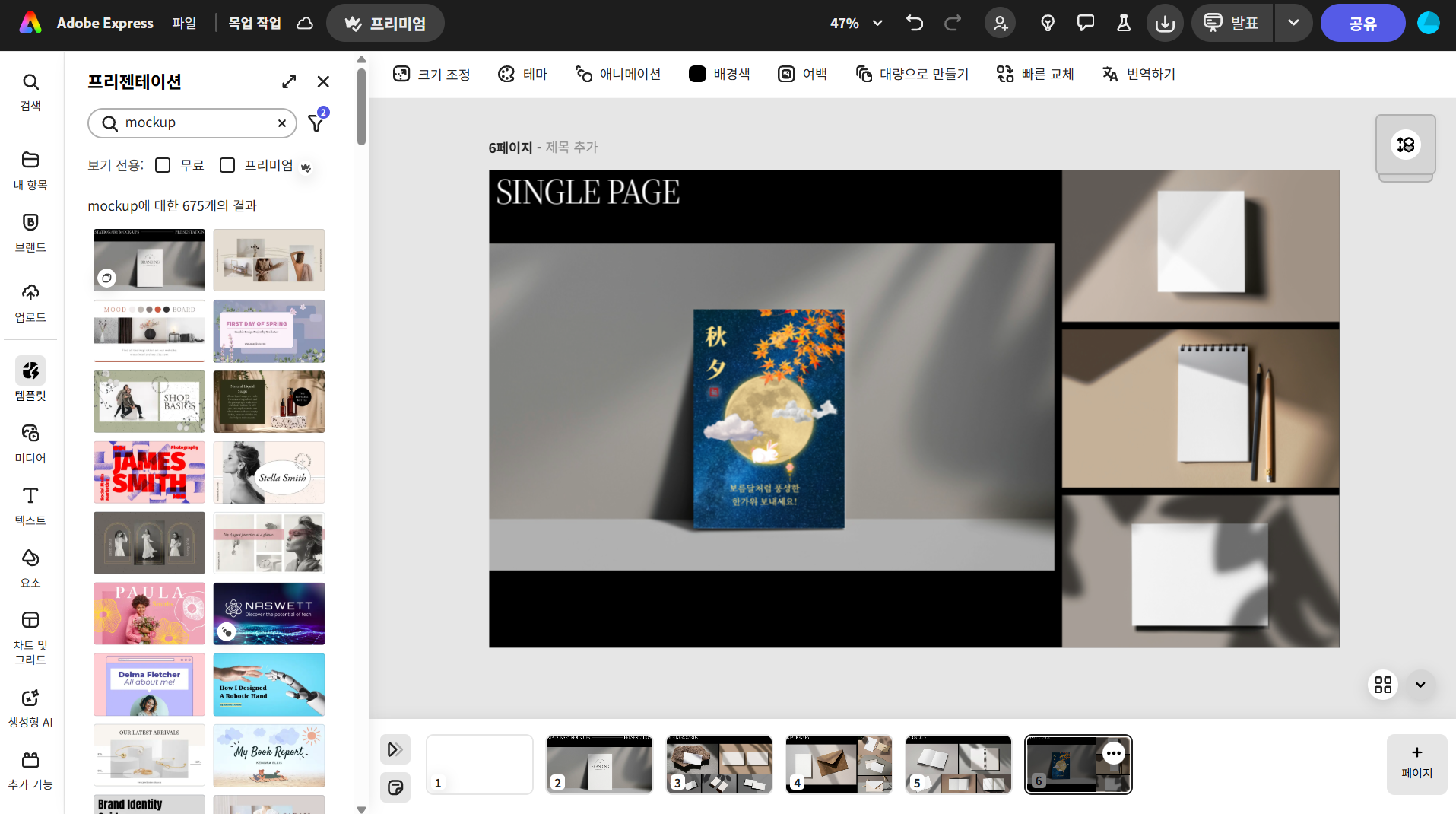 - 템플릿 활용: 어도비 익스프레스 홈화면의 '템플릿' 탭에서 "mockup"으로 검색하면 이미 목업이 포함된 템플릿을 찾을 수 있습니다. 템플릿을 선택하여 작업화면에 열고 원하는 디자인 이미지를 삽입하여 조합합니다.