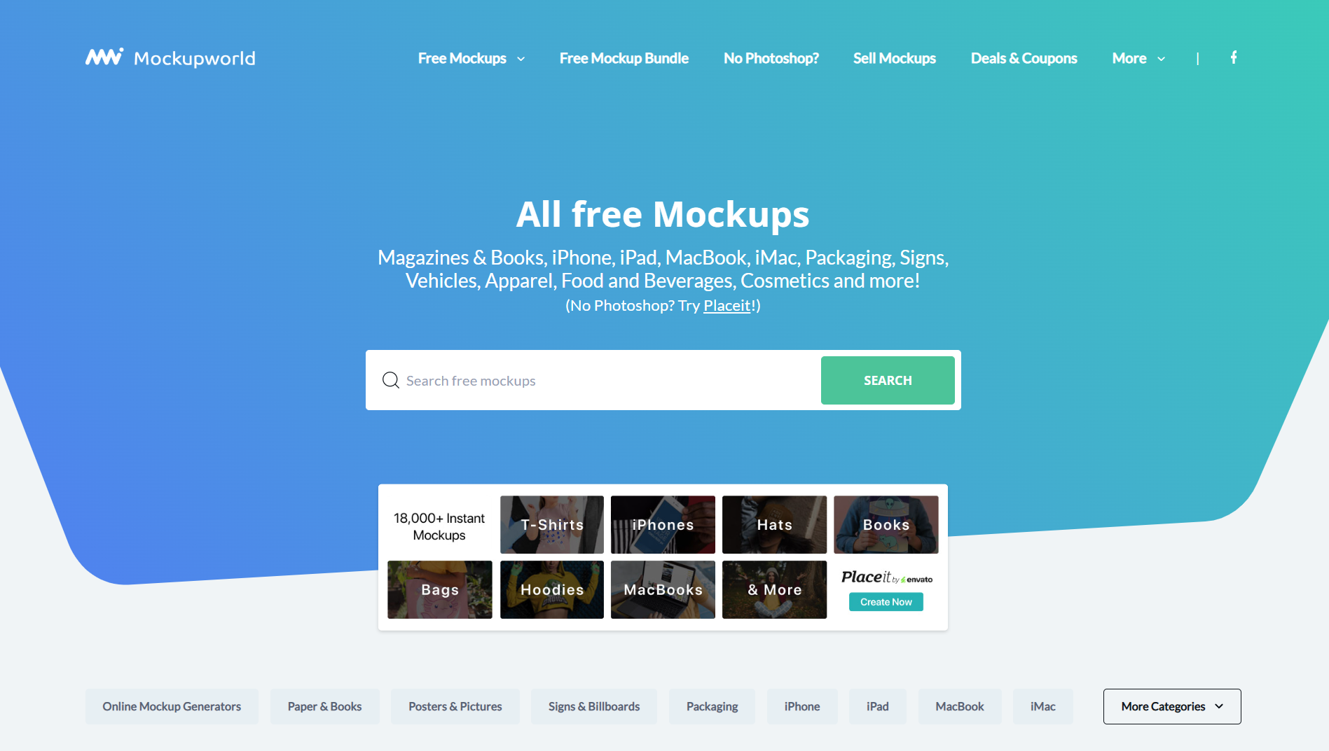 - Placeit : 의류, 디지털 기기, 인쇄물 등 다양한 카테고리의 목업을 제공하며 일부는 무료, 대부분은 유료로 이용 가능합니다.