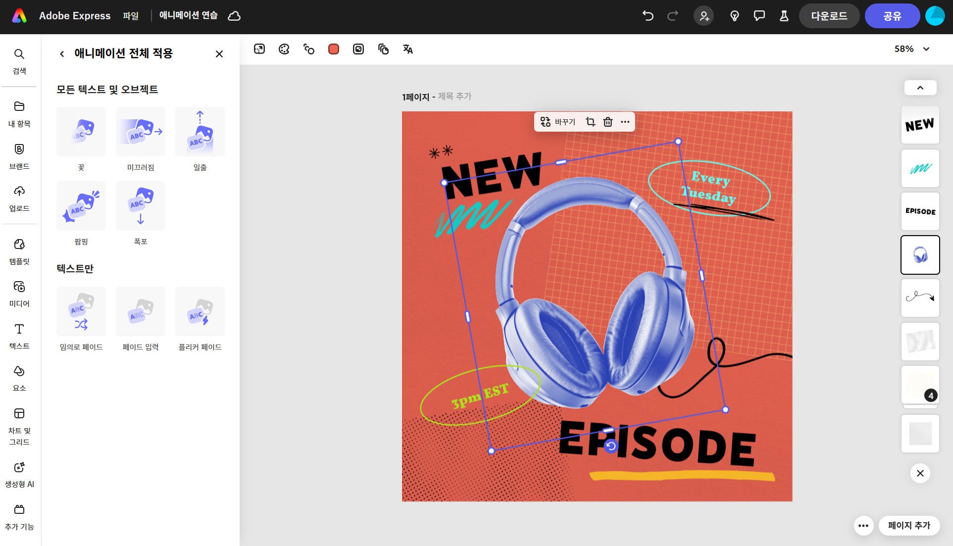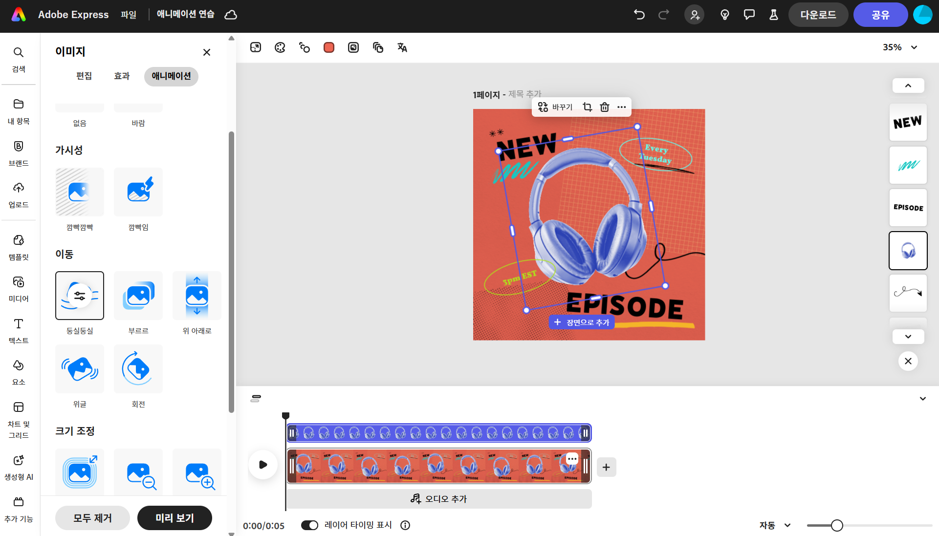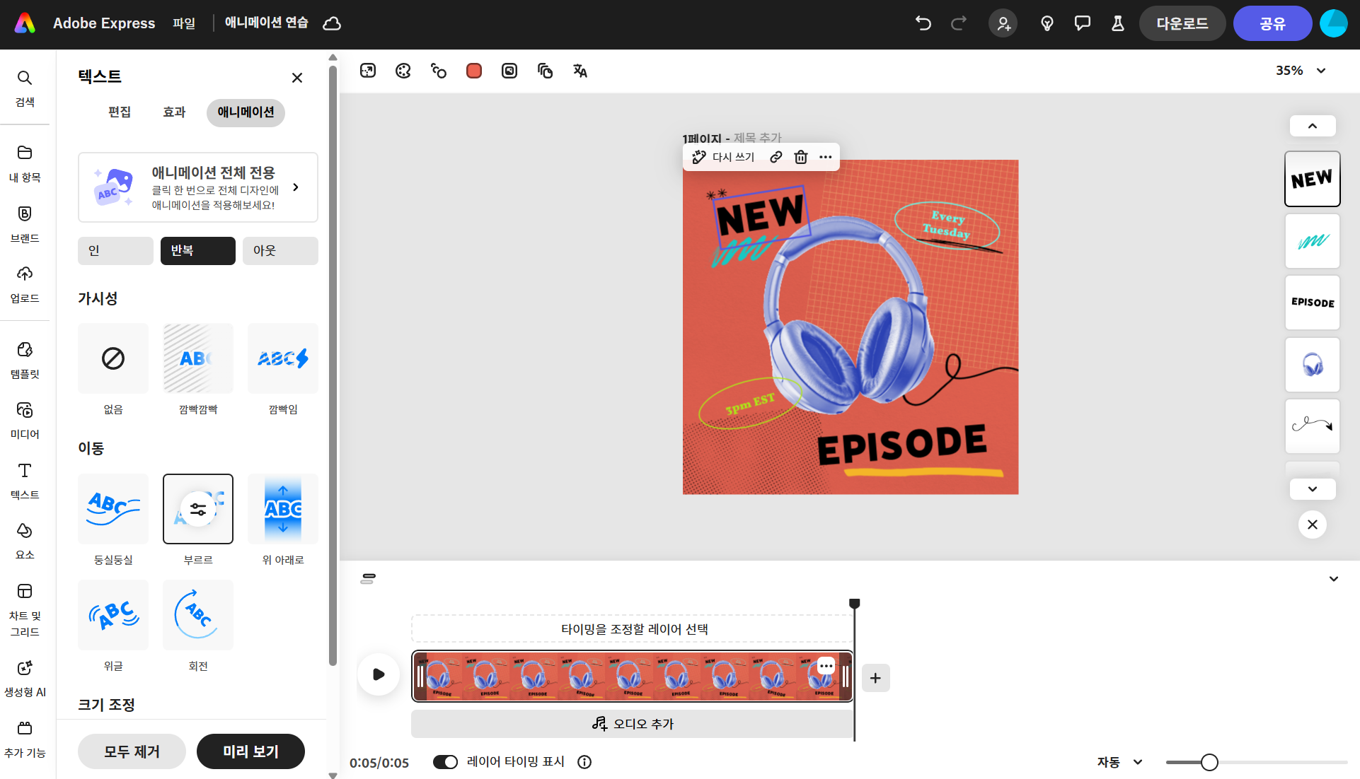 어도비 익스프레스는 사용자의 목적과 숙련도에 맞춰 다양한 애니메이션 옵션을 제공합니다. 애니메이션 효과를 적용하면 작업화면 하단에 타임라인 편집창이 나타나 애니메이션의 플레이 시간을 조절하거나 오디오를 추가할 수 있습니다. 어도비 익스프레스에서 애니메이션을 적용한 디자인은 다운로드 시 GIF는 지원하지 않으면 MP4를 선택하여 다운로드해야 합니다.