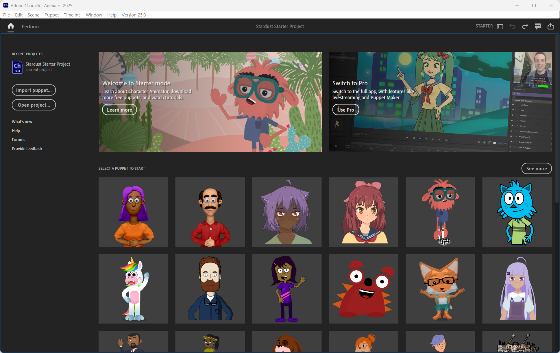 - 프로그램에서 제공하는 샘플 퍼펫을 사용하면 순식간에 애니메이션을 만들 수 있습니다. 퍼펫을 선택하거나 퍼펫 파일을 가져온 뒤 목소리를 추가하거나 녹음하면 됩니다. 기본적인 캐릭터 애니메이션 효과를 연출할 수 있습니다.