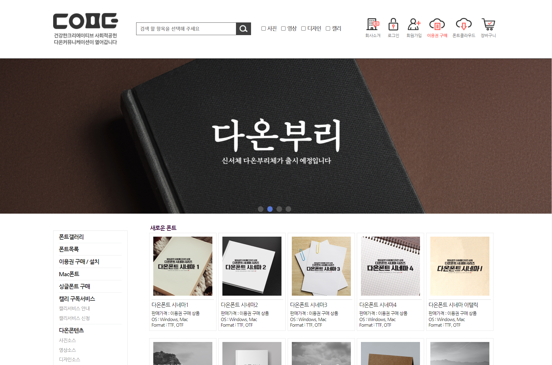 다온 커뮤니케이션에서 개발한 글꼴을 다온폰트 사이트에서 제공하고 있습니다. 유료 글꼴도 있지만 주기적으로 무료 글꼴도 제공하고 있기 때문에 좋은 무료 글꼴을 구하기에도 좋습니다. 하지만 무료 글꼴로 공개되었다가 유료로 전환되는 경우도 있으므로 저작권을 꼭 확인하고 사용하셔야 합니다.
