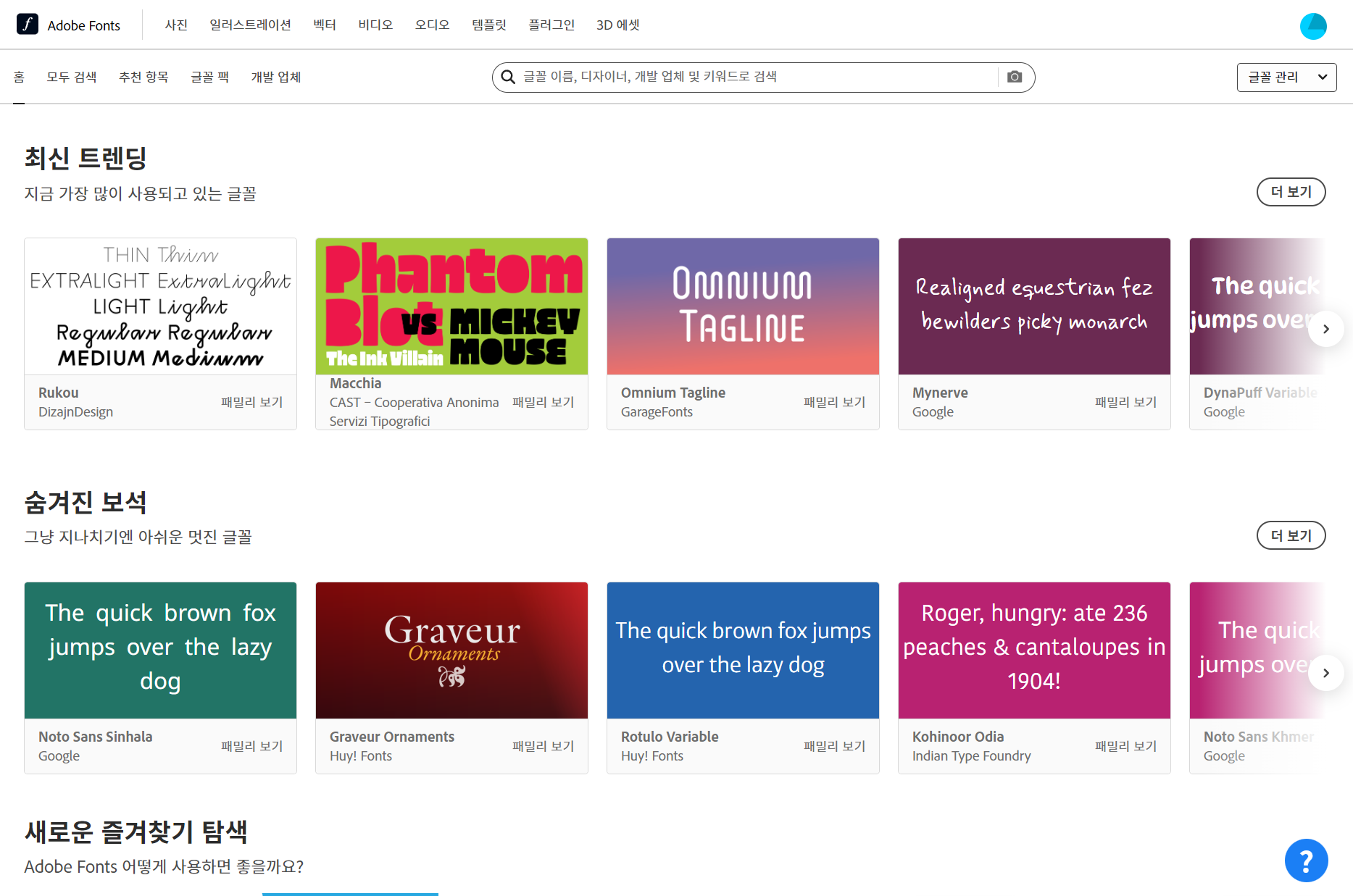 포토샵과 일러스트레이터를 배포하는 어도비사는 자체 사용자를 위해 글꼴 서비스를 제공합니다. 어도비 CC 앱을 설치하면 무료와 유료 글꼴을 모두 제공하며 어도비 계정이 있어야 사용이 가능합니다. 기존에 어도비 포토샵 CC 나 일러스트레이터 CC 를 사용하는 사용자는 어도비 계정이 있으므로 어도비 폰트에서 제공하는 글꼴을 동기화하여 프로그램 안에서 바로 사용할 수 있어 매우 편리합니다. 구글 폰트와 겹치는 글꼴이 있으며 영문 글꼴이 다양한 반면 상대적으로 한글 글꼴의 수가 적은 편입니다. 만약 글꼴이 동기화되지 않으면 어도비 프로그램 사용이 불편할 수 있습니다.