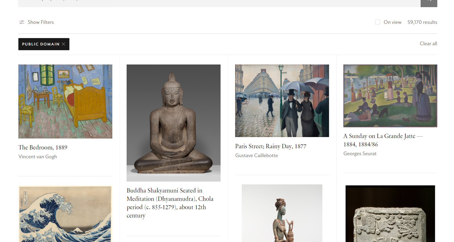 시카고 미술관 The Art Institute of Chicago 은 세계적으로 유명한 예술 작품을 수집하고 전시하는 곳으로, 다양한 시대와 지역에서 온 수천 점의 작품을 소장하고 있습니다. 이곳은 특히 인상주의, 현대미술, 그리고 아메리카 원주민 예술 등을 포함하여 광범위한 장르를 아우르는 컬렉션으로 잘 알려져 있습니다. 시카고 미술관은 150만 점의 소장품 가운데 명화 4만4313점이 고화질 이미지로 보관된 디지털 아카이브를 무료로 공개하고 있습니다. 이 미술관의 대표적 작품인 조르주 쇠라의 '그랑드자트 섬의 일요일 오후', 피에르-오귀스트 르느와르의 '두 자매', 구스타브 카유보트의 '비오는 날 파리 거리'를 비롯해 저작권 보호 기간이 만료됐거나, 저작권에 제한을 받지 않는 작품이 대상입니다. Art&Artists 메뉴에서 Artworks 를 선택하고 Collection 페이지의 검색 필터에서 저작권이 만료된 퍼블릭 도메인 Public Domain 을 설정하여 검색하면 편리합니다.