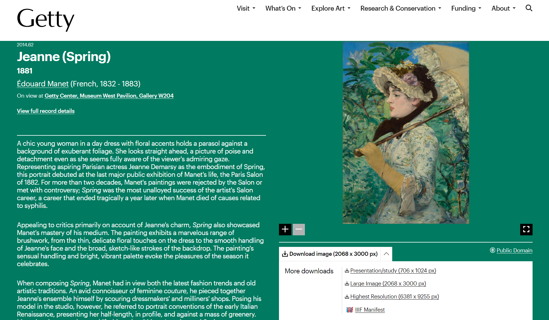 게티 오픈 콘텐츠 프로그램 Getty open content program 은 게티 박물관의 주요 디지털 자원을 무료로 공유하는 공공 서비스입니다. 이 프로그램은 퍼블릭 도메인 Public Domain에 속하는 디지털화된 예술 작품뿐만 아니라 다수의 예술 역사 텍스트와 예술 서적을 고해상도 디지털 형식으로 제공하며, 사용자는 저작권 제한 없이 이미지를 다운로드하고 사용할 수 있습니다. 88,000개가 넘는 고품질의 역사적 사진들이 포함되어 있으며, 수세기에 걸쳐 다양한 사진 매체로 제작된 이미지들을 크리에이티브 커먼즈 제로(Creative Commons Zero, CC0) 라이선스 하에 자유롭게 이용할 수 있습니다. 메뉴에서 Explore Art 를 선택하고 Image for Download 를 선택하여 검색합니다.