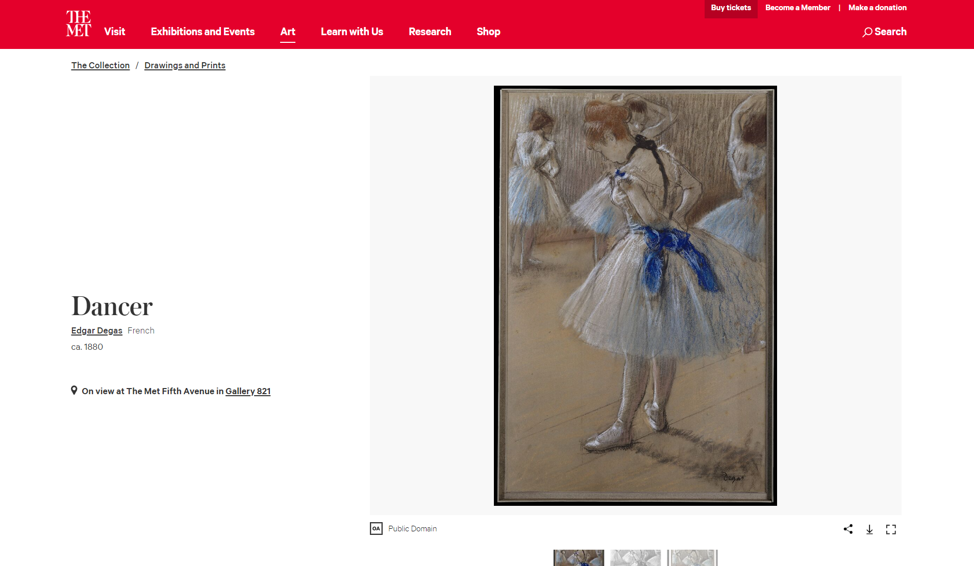 메트로폴리탄 미술관 Metropolitan museum of art 은 2017년 2월, 공공 도메인에 속하는 모든 예술품 이미지와 컬렉션에 대한 기본 데이터를 크리에이티브 커먼즈 제로(Creative Commons Zero, CC0) 라이선스 하에 제한 없이 사용할 수 있도록 하는 오픈 액세스 정책을 도입했습니다. 이로써 누구나 메트로폴리탄 미술관이 소장한 예술작품의 디지털 자료 약 37만 장을 이미지와 데이터를 자유롭게 다운로드하고 공유하며, 재창작할 수 있게 되었습니다. Art 메뉴에서 The Met Collection을 선택하고 검색 필터로 퍼블릭 도메인 Public Domain 을 설정하여 검색합니다.
