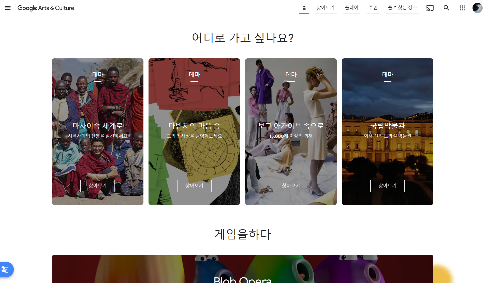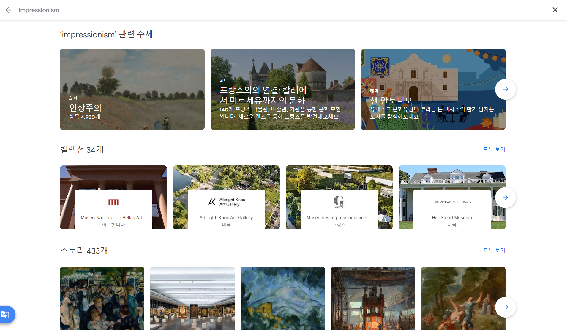 Google Arts & Culture는 구글이 전 세계의 문화 기관들과 협력하여 수많은 예술 작품과 문화 유산을 고해상도 이미지와 동영상으로 제공하는 온라인 플랫폼입니다. 이 서비스를 통해 다양한 주제를 가진 온라인 기획 전시가 계속 이어집니다. 검색창에서 키워드로 검색하면 관련 예술가, 테마, 전시 등을 결과로 확인할 수 있습니다. 다만 이 전시를 통해서는 이미지를 파일로 다운로드할 수 없으므로 여기서 멋진 이미지를 찾았다면 위키미디어 커먼즈 Wikimedia Commons 등의 공공 검색 사이트에서 찾아 다운로드 할 수 있습니다.
