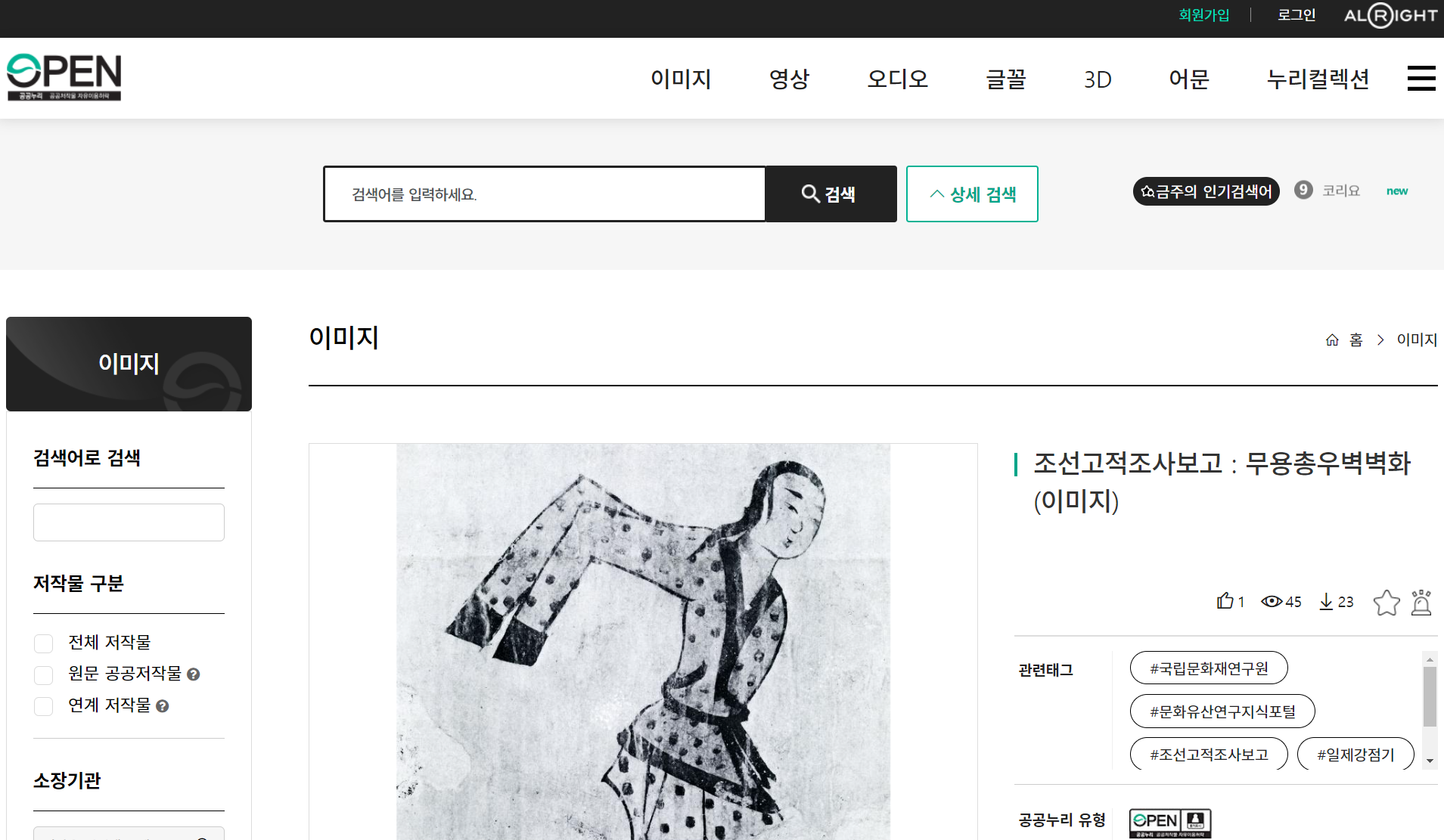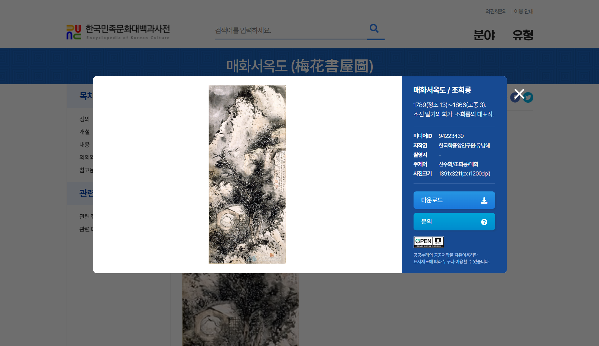 한국민족문화대백과사전은 한국 문화의 집대성을 이룬 권위 있는 백과사전입니다. 1980년부터 시작된 한국학 연구의 장기 프로젝트 결과물로, '웃음', '한(恨)', '귀신' 등 한국 문화의 심층적 이해를 가능하게 하는 다양한 항목을 포함하고 있습니다. 지속적인 개정과 증보를 통해 시대의 변화에 부응하며, 한국학 각 분야의 전문 연구자들이 내용을 집필하여 한국 문화에 대한 권위 있는 정보를 자랑합니다. 웹사이트의 분야 메뉴에서 예술·체육 항목 아래 회화를 선택하고 키워드를 입력하여 원하는 이미지를 찾을 수 있습니다. 백과사전 전체 콘텐츠 중 자유 이용이 가능한 콘텐츠는 '공공누리' 마크를 달아 표시하고 있습니다. 따라서 이용자는 '공공누리' 마크 부착 콘텐츠에 한하여 이용하실 수 있습니다. '공공누리' 마크가 부착되어 있지 않은 자료는 저작자로부터 한국민족문화대백과사전 서비스에만 이용하도록 허가 받은 저작물로서 이용 허락 대상에서 제외됩니다. 대부분의 이미지가 공공누리 마크가 붙어 있지 않으므로 사용에 주의가 필요합니다.