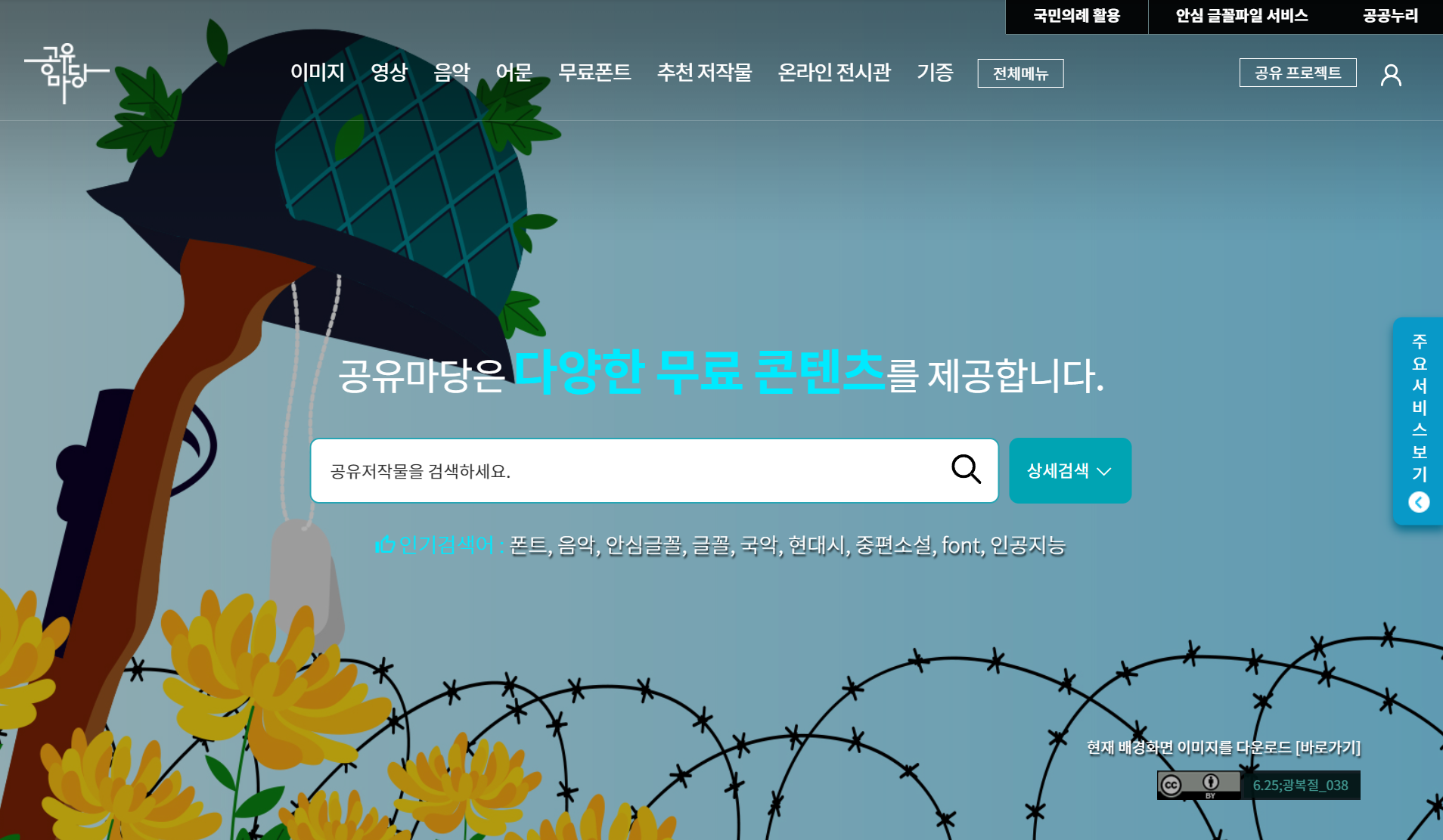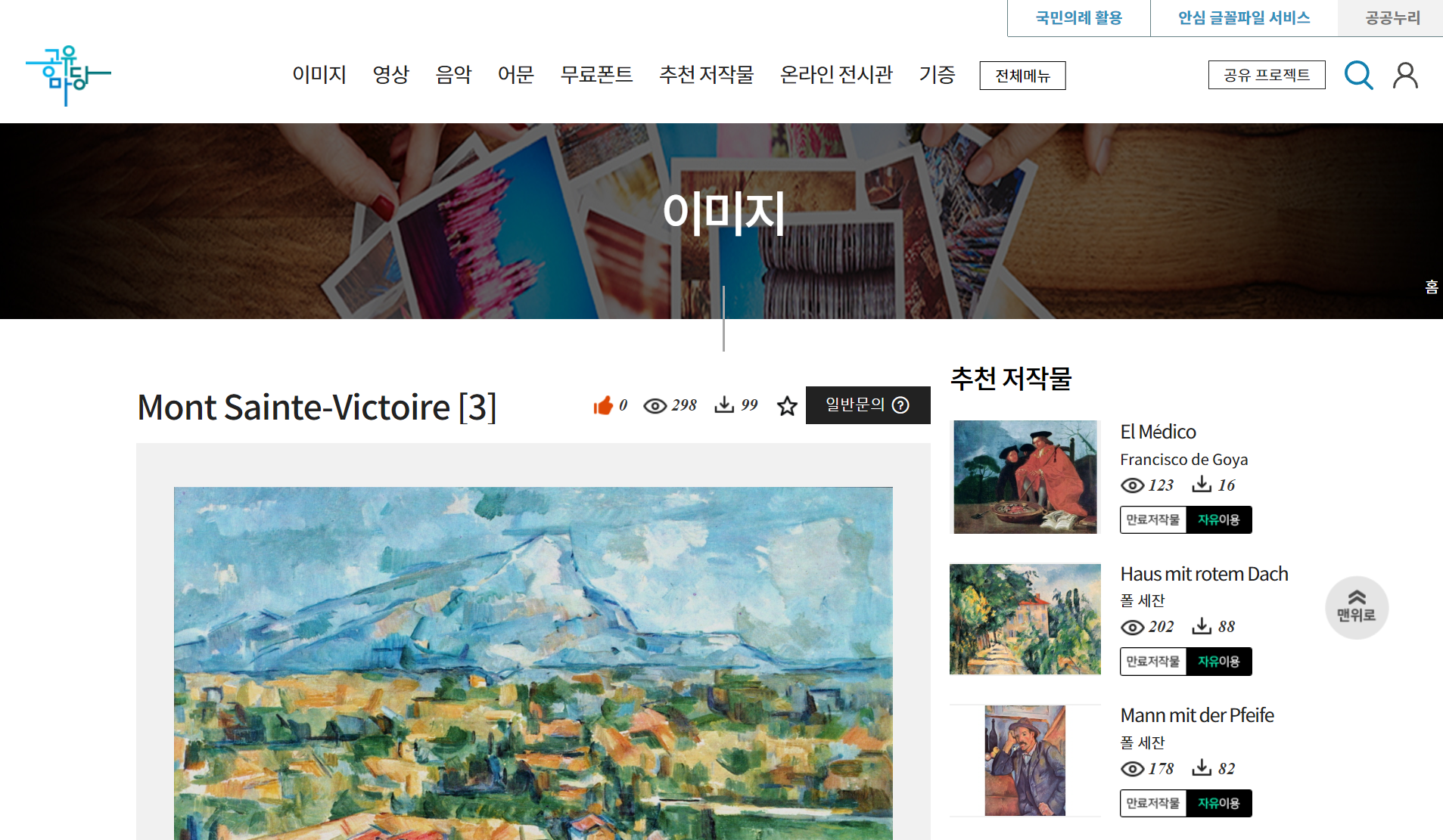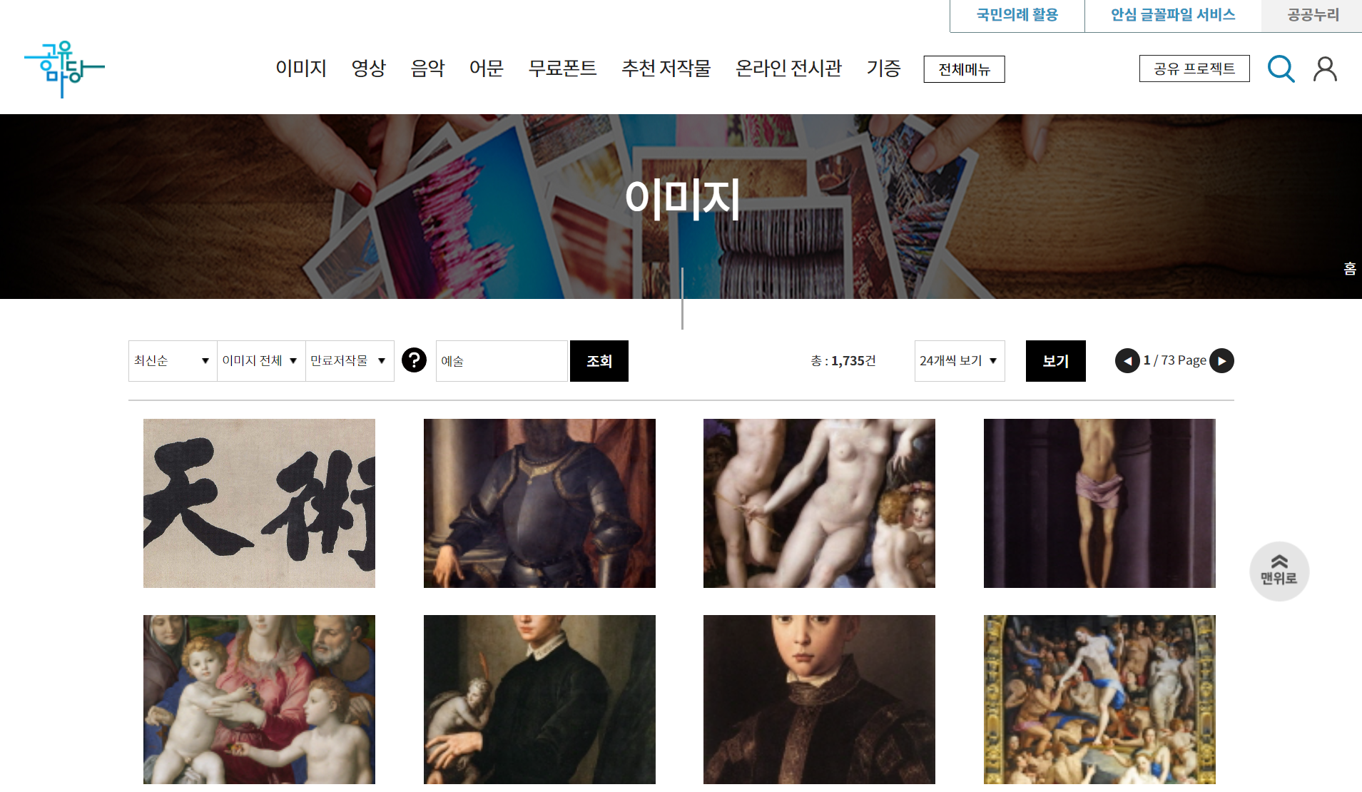공유마당은 한국저작권위원회에서 제공하는 무료 콘텐츠 공유 서비스로, 사용자들이 저작권 걱정 없이 다양한 자료를 이용할 수 있는 플랫폼입니다. 이 사이트는 폰트, 음악, 일러스트, 사진 등의 저작물을 포함하여 교육, 1인 미디어, 인공지능 학습 데이터 등 다양한 분야에 활용할 수 있는 공유저작물을 제공합니다. 이미지 항목에서 저작권 옵션을 ‘만료저작물’로 설정하고 ‘예술’ 등의 키워드로 검색하면 됩니다.