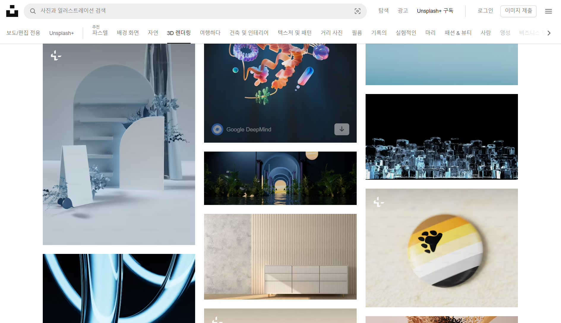Unsplash는 무료 사진 스톡 사이트로 이전에 소개 드린 적이 있습니다. 사진 외에도 3D렌더링 이미지를 함께 제공하고 있습니다. 주로 형이상학적인 배경 위주의 3D 이미지가 많은 편이며 유료와 무료 모두 제공됩니다. 사이트에서 3D렌더링 항목을 선택하시면 됩니다.