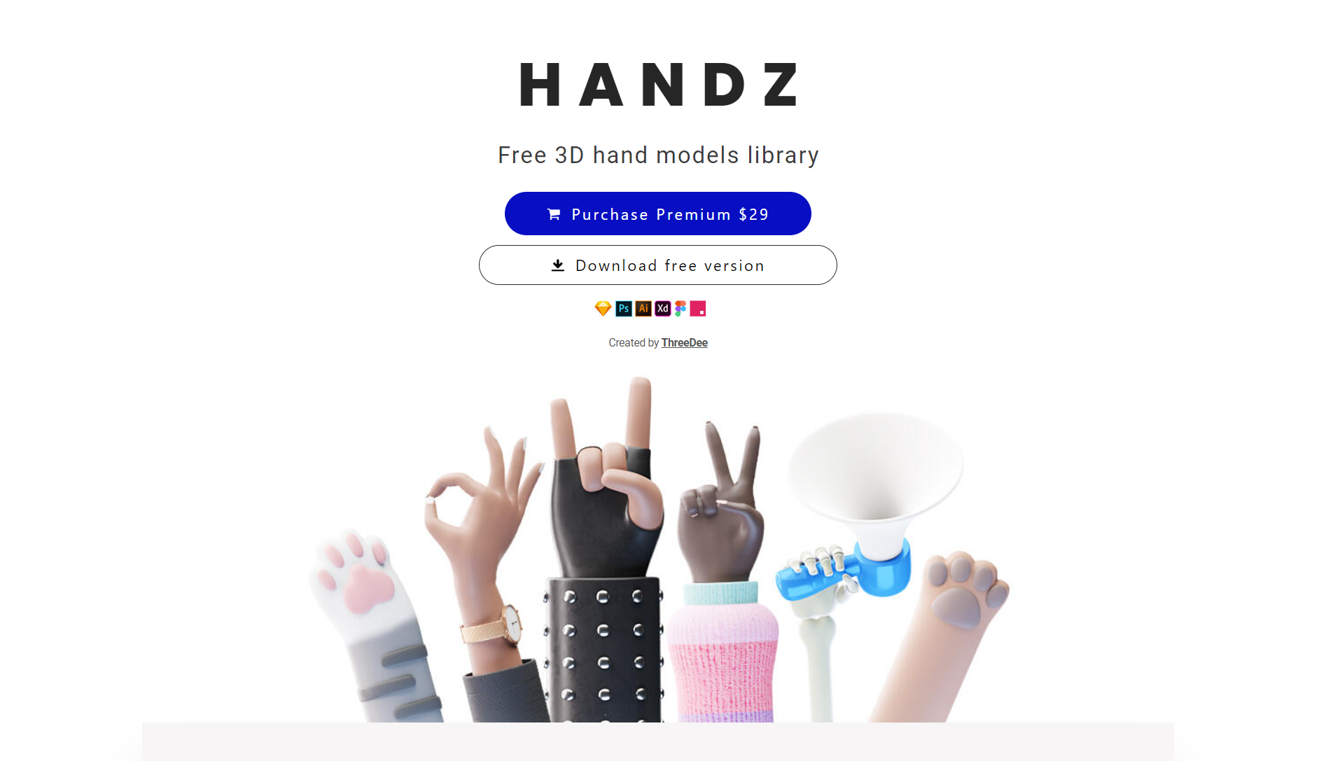 HANDZ 는 다양한 3D 손 모델을 제공하는 웹사이트입니다. 9가지 색상 스킨의 12가지 손 제스처와 3가지 슬리브 변형이 포함된 320개 이상의 PNG 파일을 무료로 얻을 수 있습니다. 프리미엄 버전에서는 더 많은 손 모델, 포즈, 액세서리, 그리고 7,000개 이상의 PNG 파일을 제공합니다. Blender를 사용하면 손가락을 조정하는 것도 가능합니다. Gumroad를 통해 다운로드 할 수 있습니다.