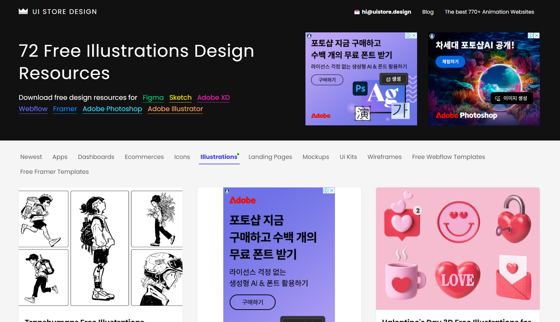 UI Store Design은 무료 디자인 리소스의 링크를 모아서 소개합니다. Figma, Sketch, Webflow, Adobe XD, Photoshop, Illustrator를 위한 600개 이상의 디자인 리소스를 자랑하는 이 사이트는, 프리미엄 품질의 오픈 소스 UI 키트와 일러스트를 제공합니다. 3D 렌더링 이미지를 원한다면 디자인 리소스 항목에서 3D로 표기된 것 중 PNG가 표시된 을 찾으시면 됩니다.