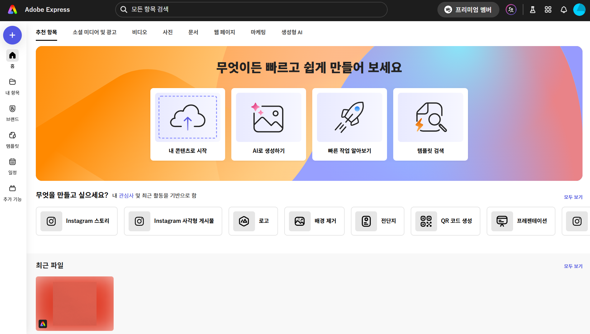 - 이미지 생성, 배경 제거 등 어도비 AI 기반 기능 사용가능