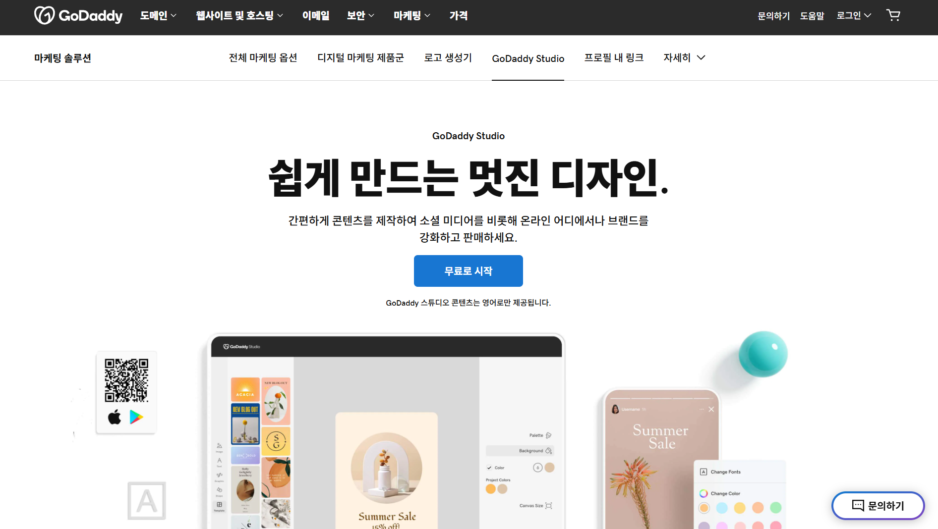 가격: 무료 (Websites + Marketing 플랜 월 13,199원) | OS: iOS, Android | 한글 지원: 인터페이스 - 영어만 지원 / 한글 폰트 - 시스템 폰트 사용 가능