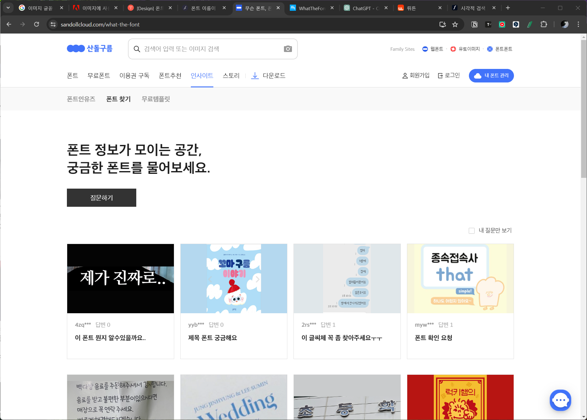 - 때로는 글꼴 식별 서비스가 정확한 결과를 제공하지 못할 수도 있습니다. 이럴 때는 디자인 커뮤니티나 소셜 미디어를 통해 도움을 요청하는 것도 좋은 방법입니다. 산돌 웹사이트의 ‘폰트 찾기’ 메뉴에서 디자인에 사용된 글꼴을 질문할 수 있습니다.
