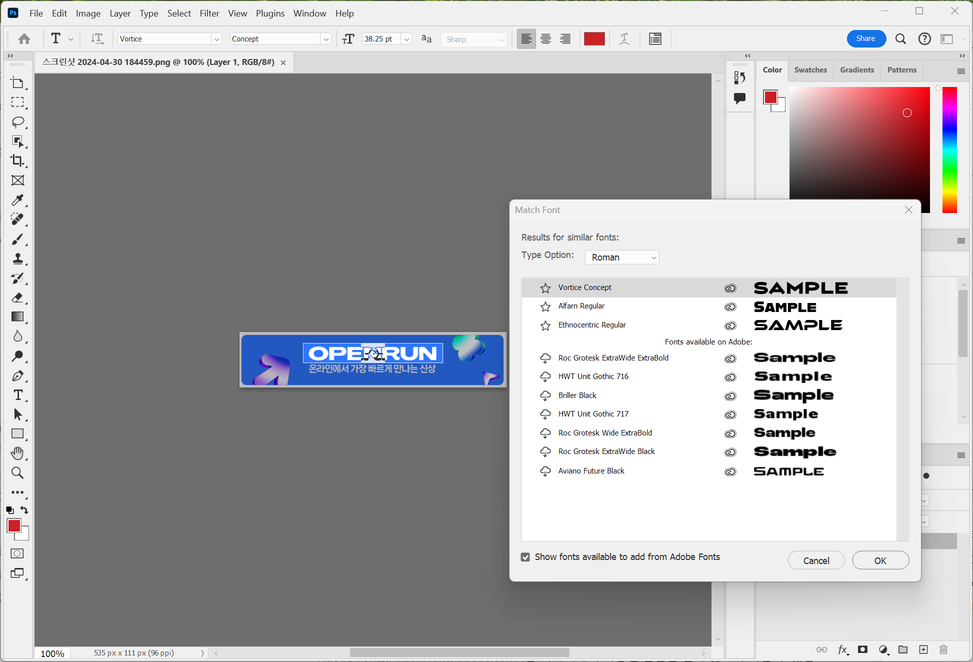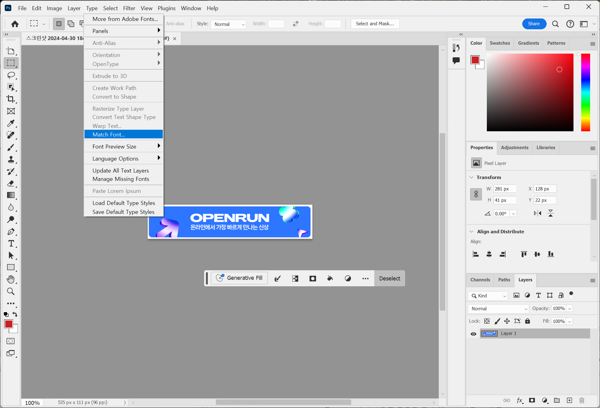 - 선택한 텍스트 영역이 활성화된 상태에서 상단 메뉴에서 타입(Type) > 매치 글꼴(Match Font)을 선택합니다. 이 기능을 선택하면 포토샵이 선택 영역 내의 텍스트를 분석하여 비슷한 글꼴을 찾기 시작합니다.