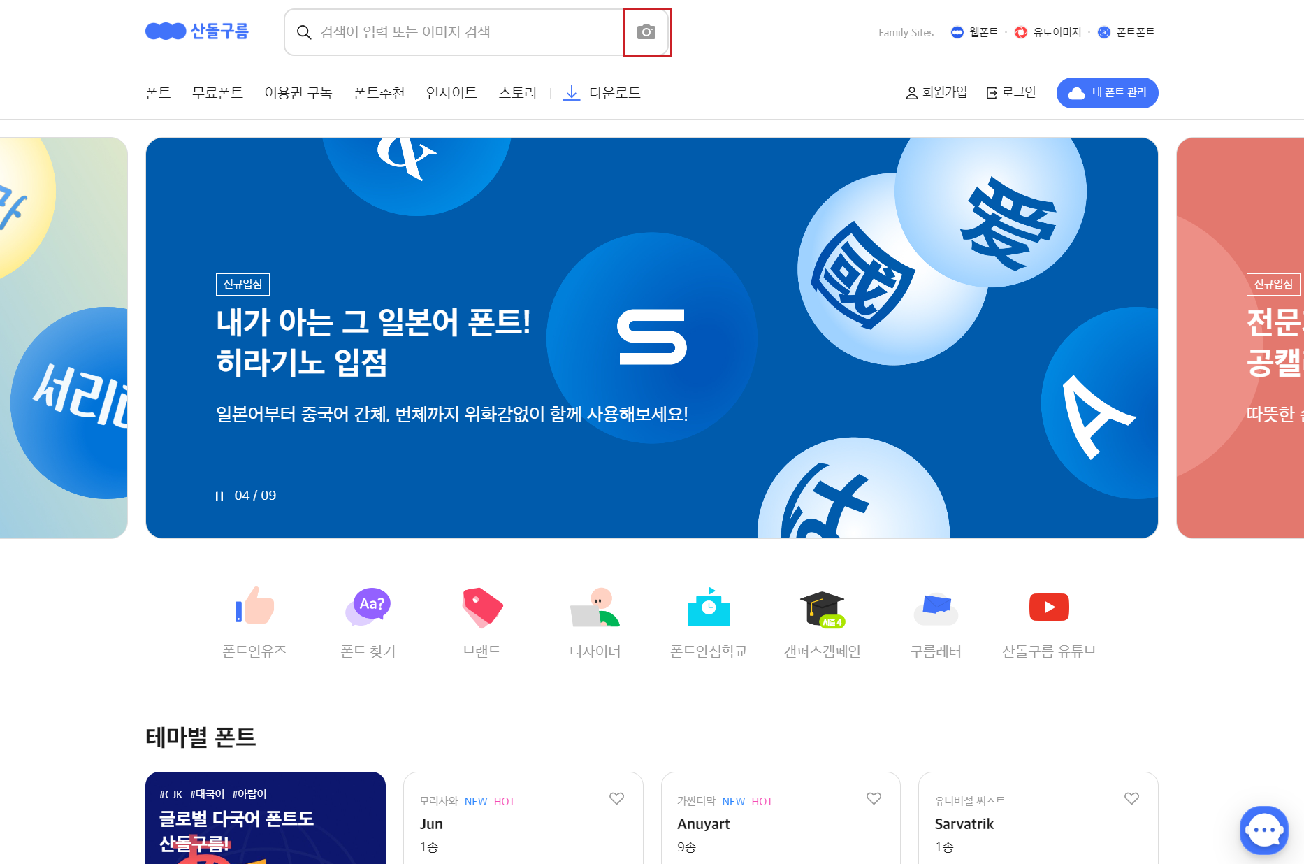 - 산돌 웹사이트에 접속하여 검색창 오른쪽의 카메라 모양 아이콘을 클릭합니다.