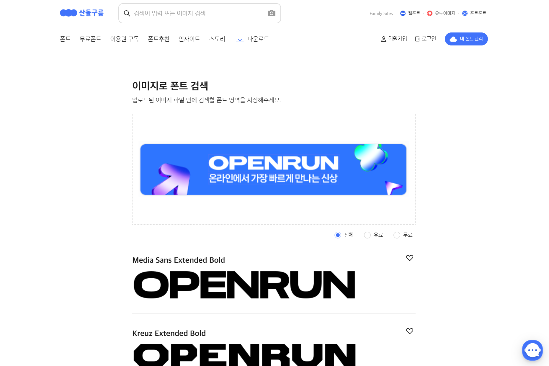 산돌 웹사이트(https://www.sandoll.co.kr/)에서 이미지를 업로드하면 유사한 한글 폰트를 찾아볼 수 있습니다. 산돌 웹사이트에서는 폰트의 라이선스 정보도 확인할 수 있어 상업적 사용 가능 여부를 확인할 수 있습니다.